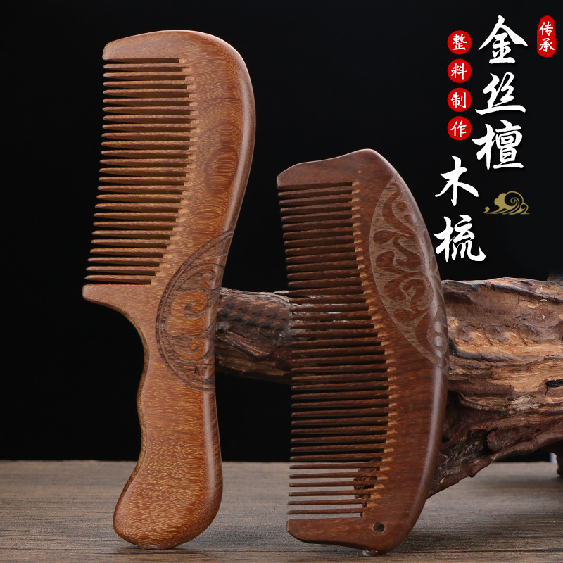 金丝檀木整木梳子厚实雕花柄梳月梳批发按摩梳头