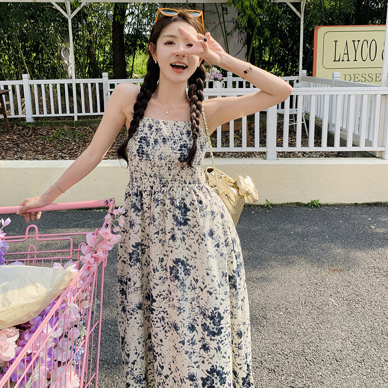 韩版夏季碎花吊带连衣裙茶歇法式女夏季新款气质收腰a字长裙