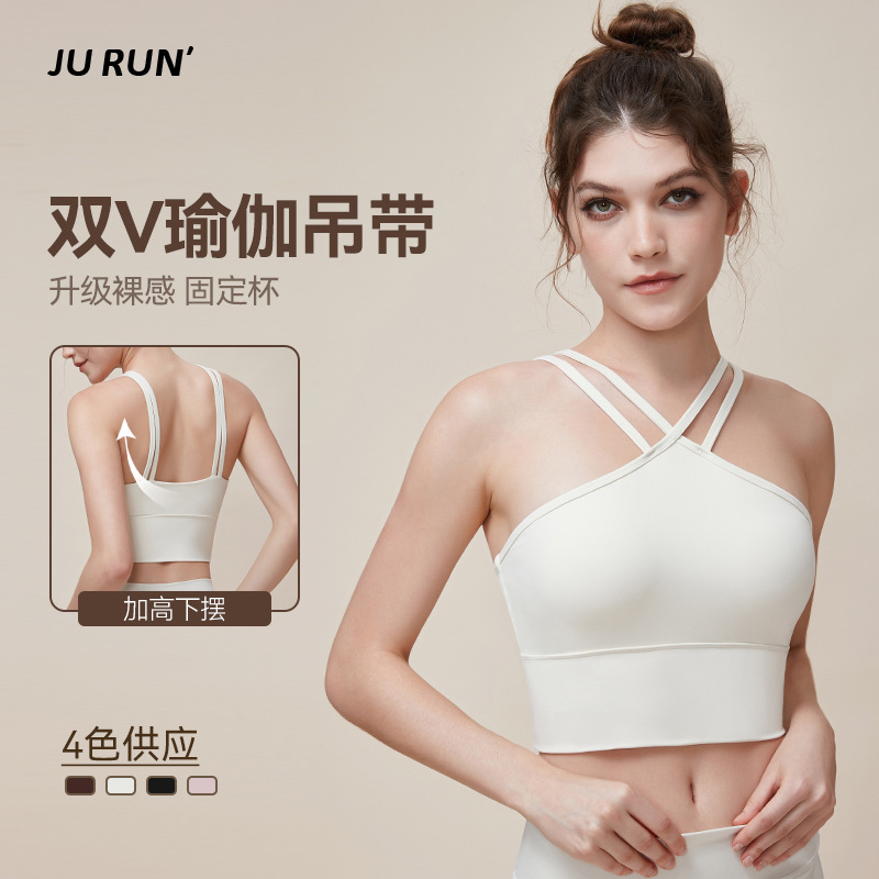 新款女芭蕾风双V瑜伽吊带瑜伽健身运动内衣 固定杯防震包副乳内衣