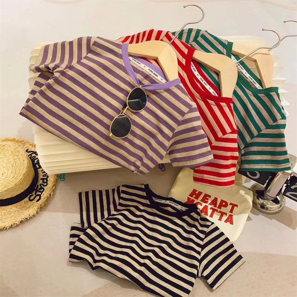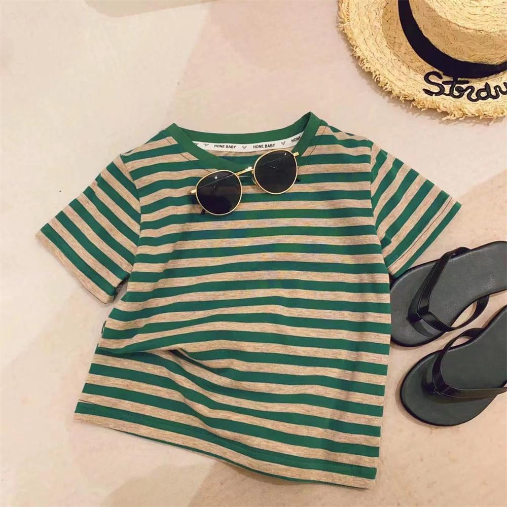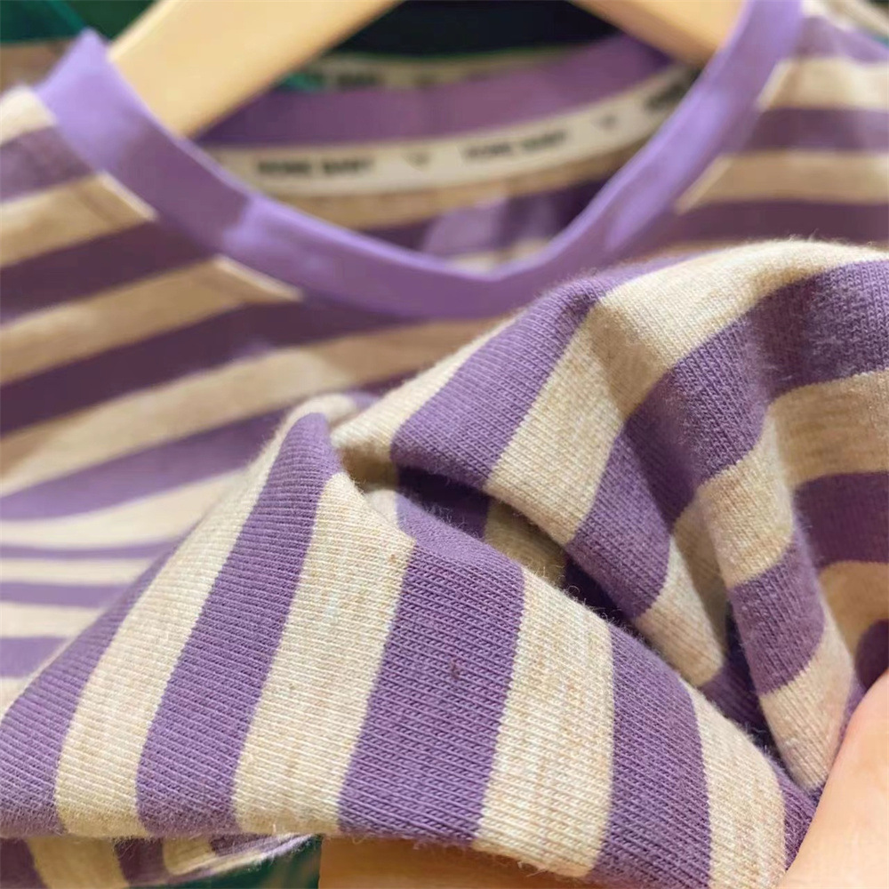 新品女童打底衫撞色包边领条纹弹力2025新款洋气短袖T恤T恤装