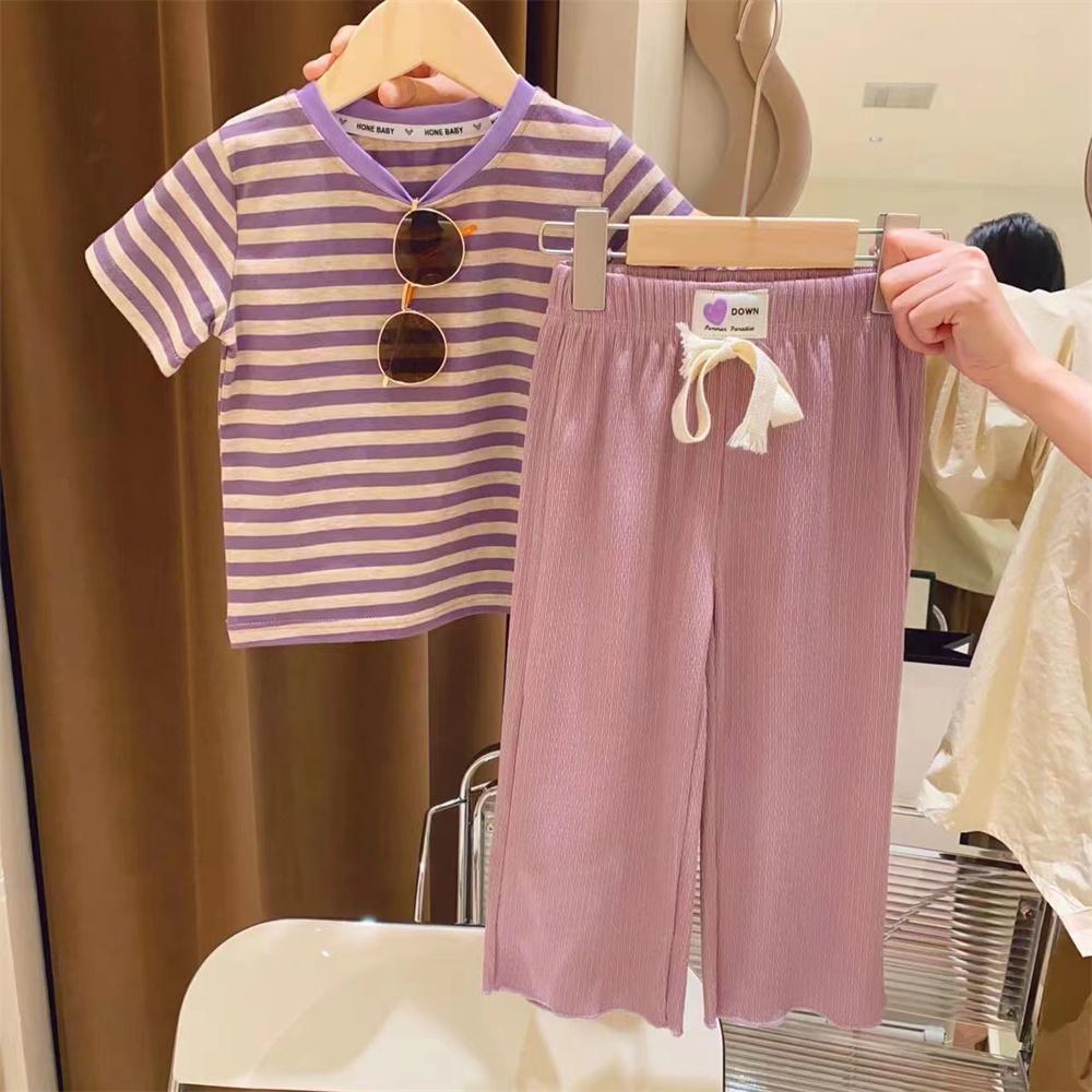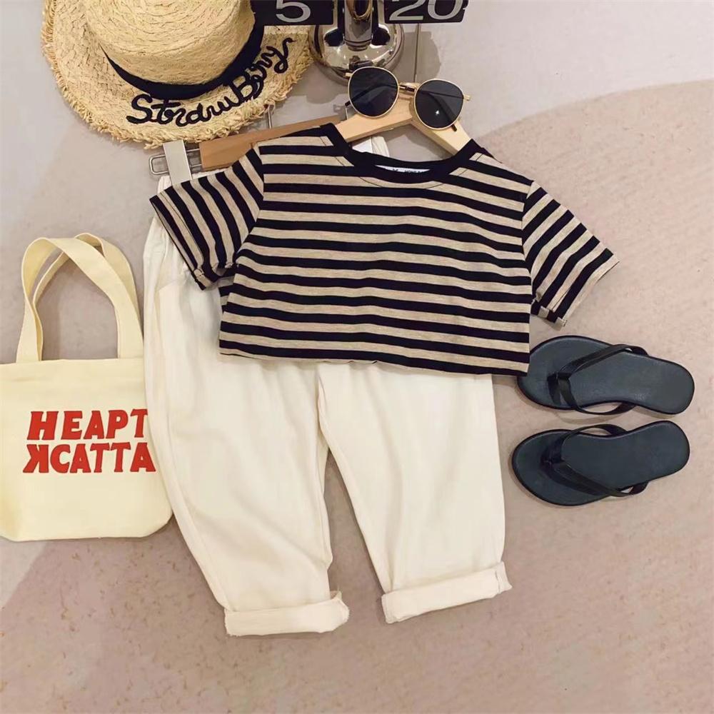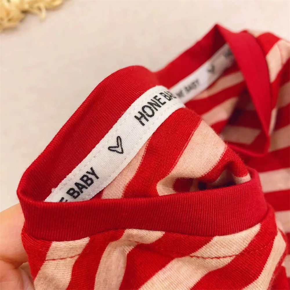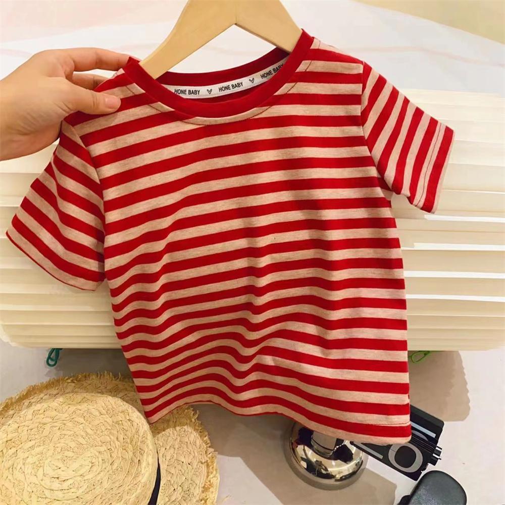 新品女童打底衫撞色包边领条纹弹力2025新款洋气短袖T恤T恤装