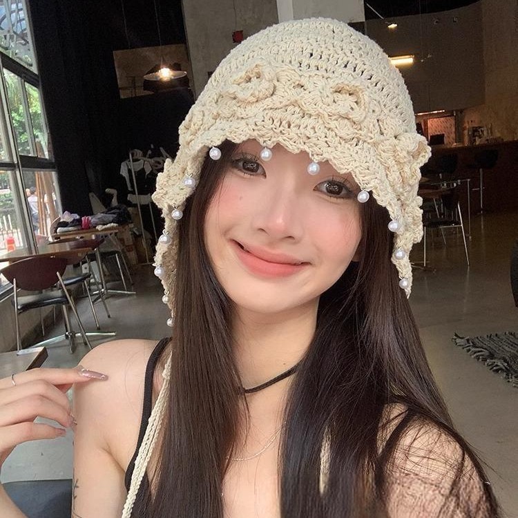 巨美~ 拍照好看!珍珠手工钩花包头帽女春夏民族风辫子编织套头帽