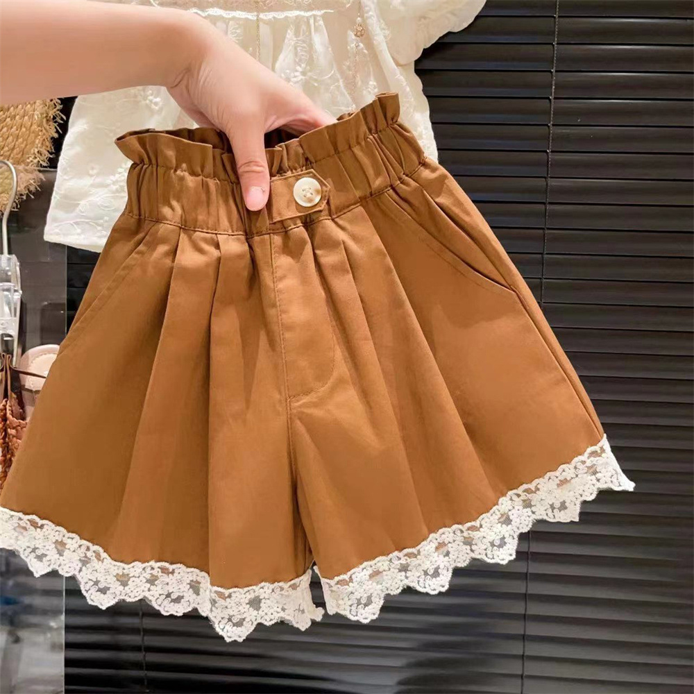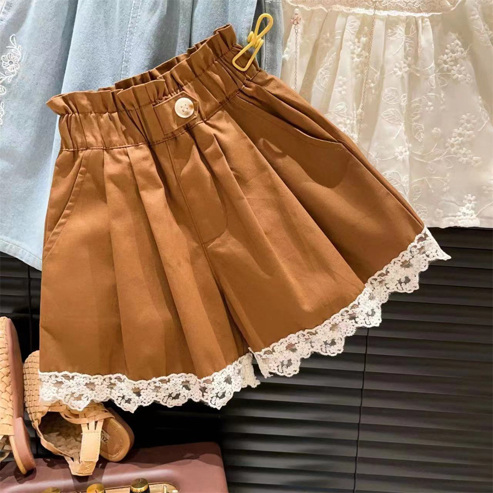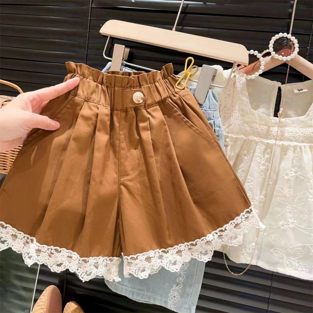 女童高腰木耳边一粒扣蕾丝包边百搭短裤热裤2025夏装新品短裤子