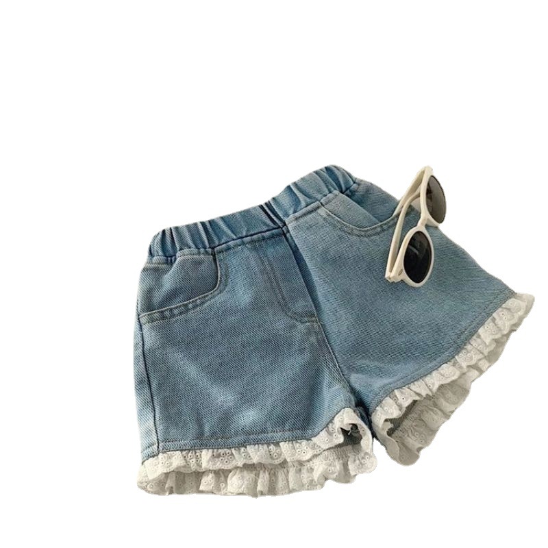 2025夏季韩版小中童热衫3三分裤儿童甜美舒适牛仔短裤蕾丝花边裤