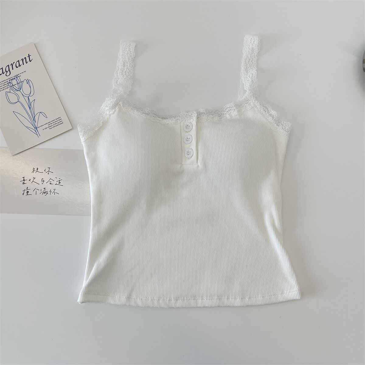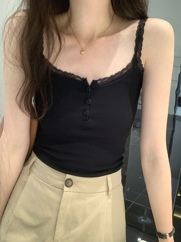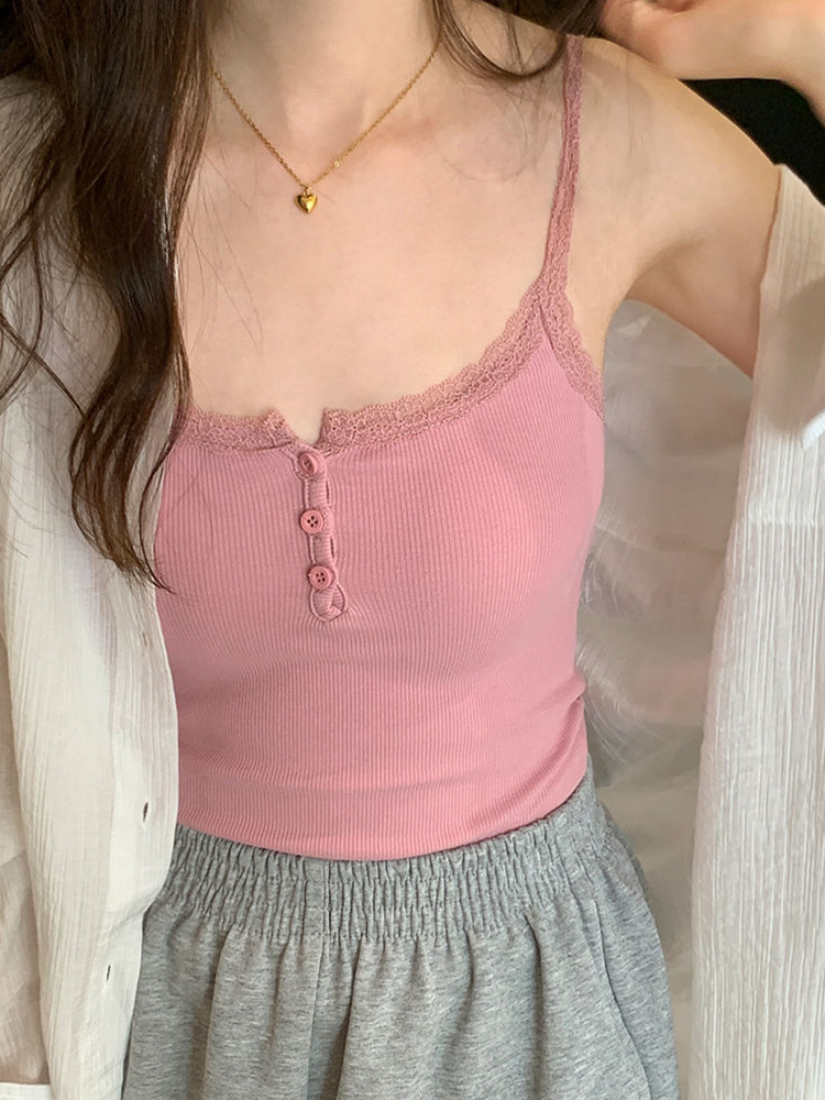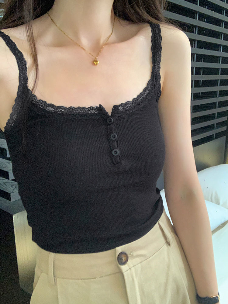法式性感蕾丝带胸垫小吊带背心女外穿夏季无袖上衣女纽扣美背短款