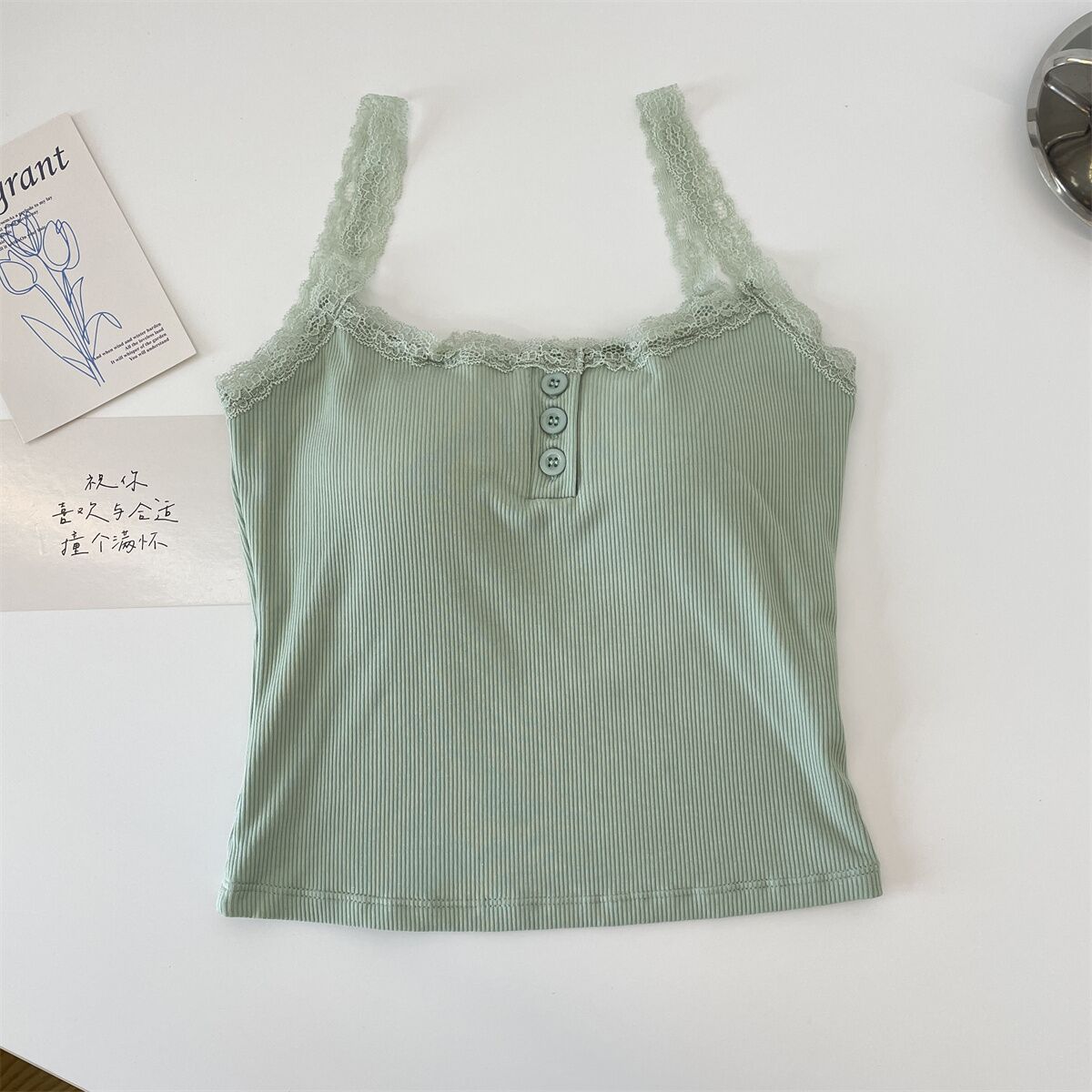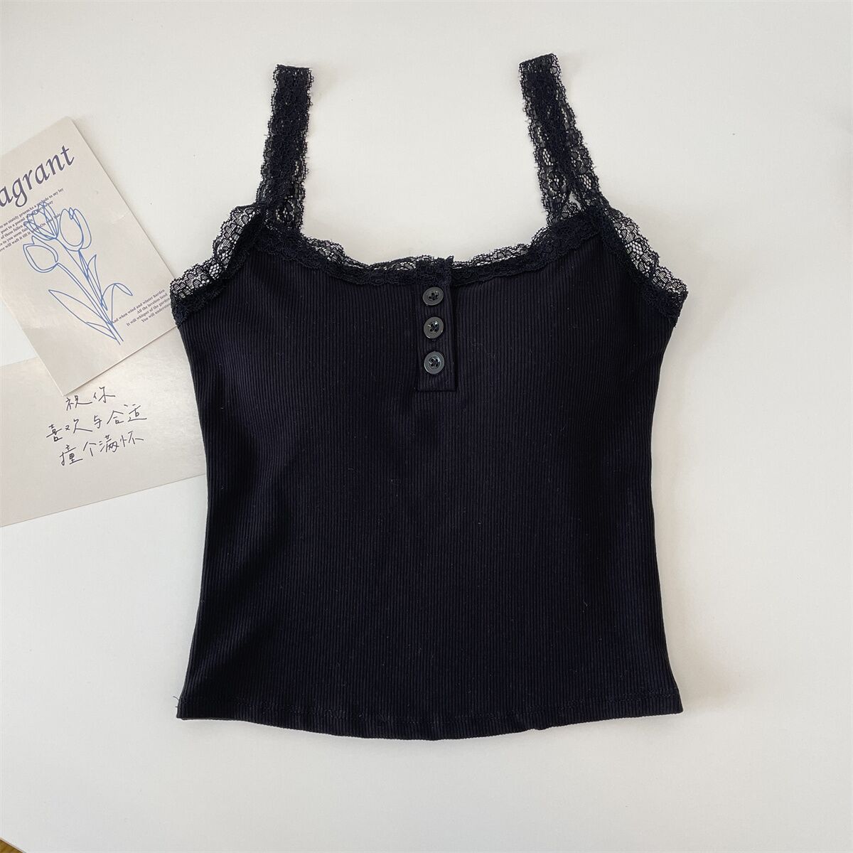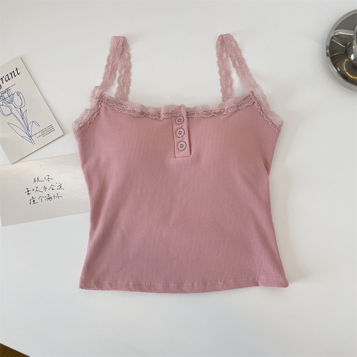 法式性感蕾丝带胸垫小吊带背心女外穿夏季无袖上衣女纽扣美背短款