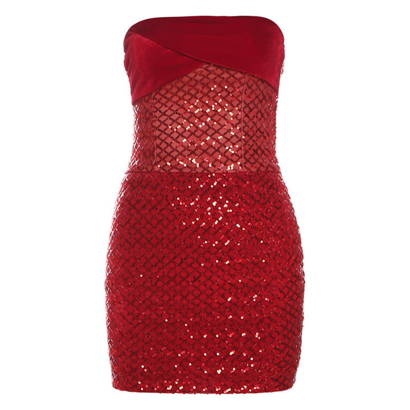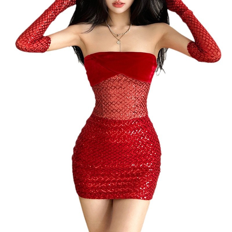 跨境欧美风新款女装一字领抹胸收腰包臀连衣裙纯色手套