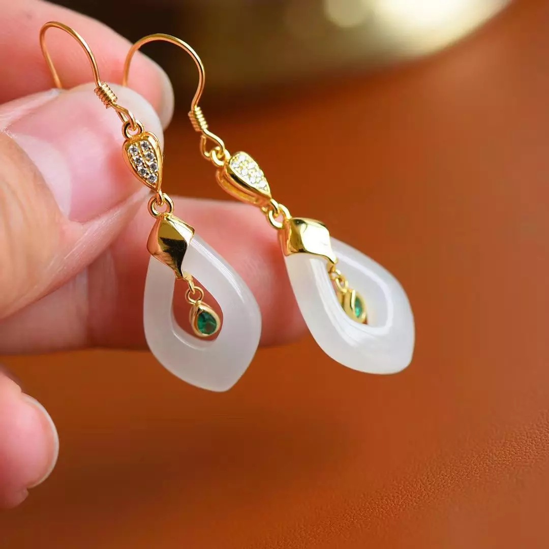 复古白玉羊脂玉耳环s925纯银古法金镶嵌裸石有特色款式时尚简约