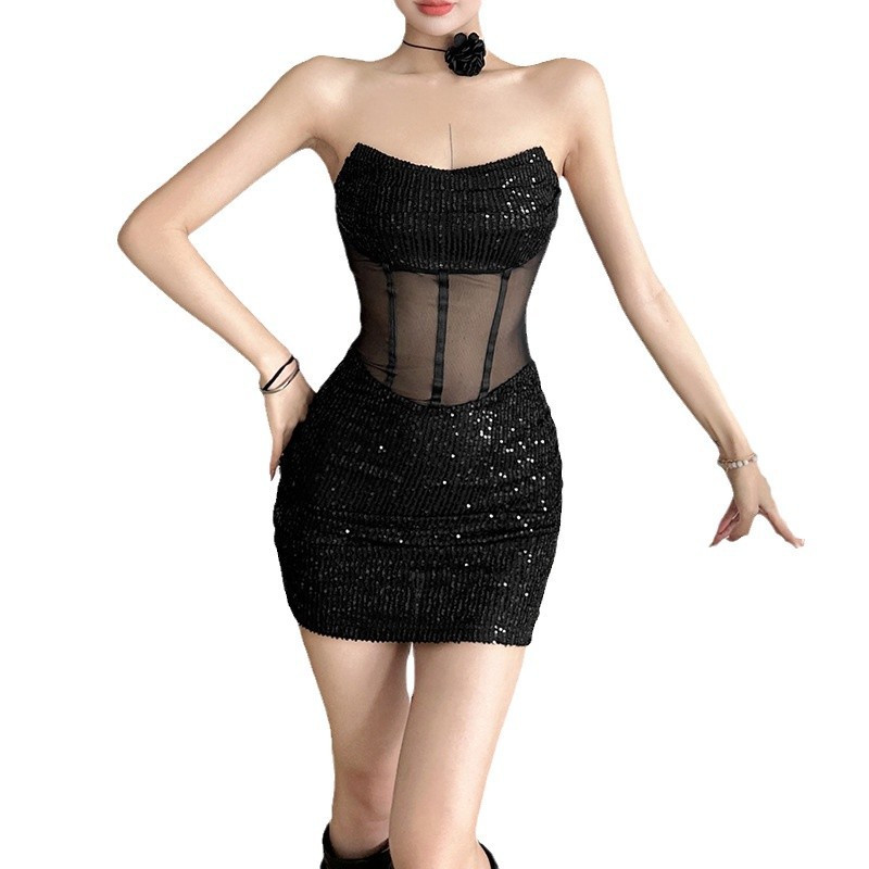 跨境欧美风新款女装透视腰封网状亮片纯色无袖裹胸连衣裙