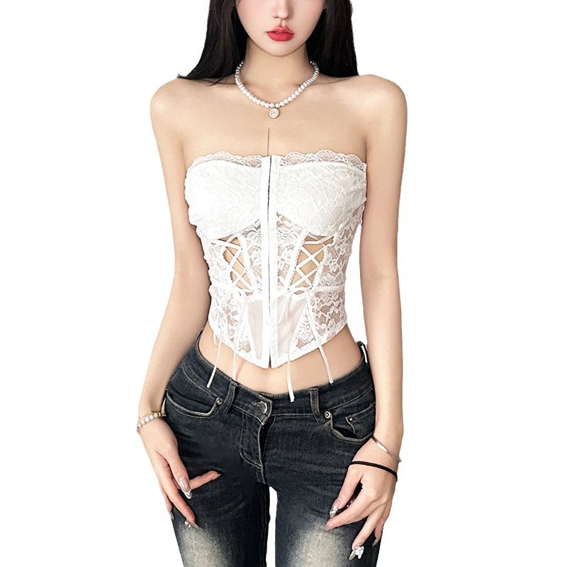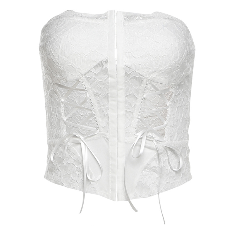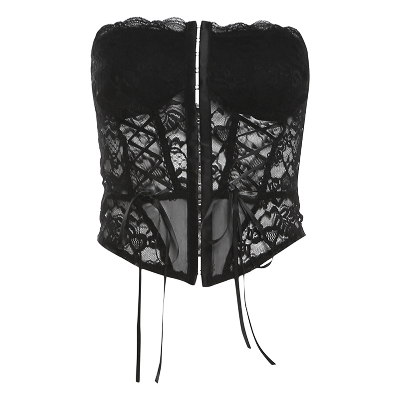 跨境欧美风新款女装蕾丝镂空透视系带裹胸纯色百搭上衣