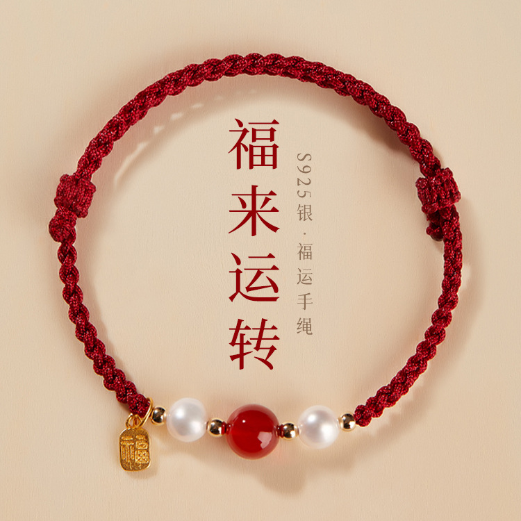 S925本命年红绳手链女小福牌好运珍珠玛瑙转运珠编织手绳男