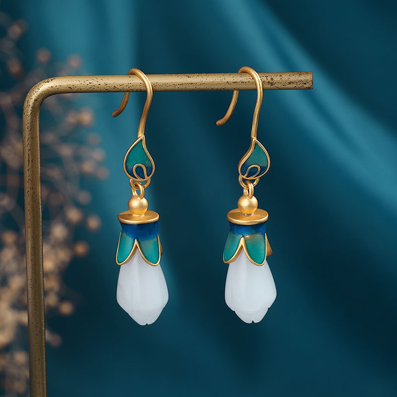 古典宫廷风设计珐琅镶和田白玉玉兰花耳钩汉服古装搭配耳坠饰品
