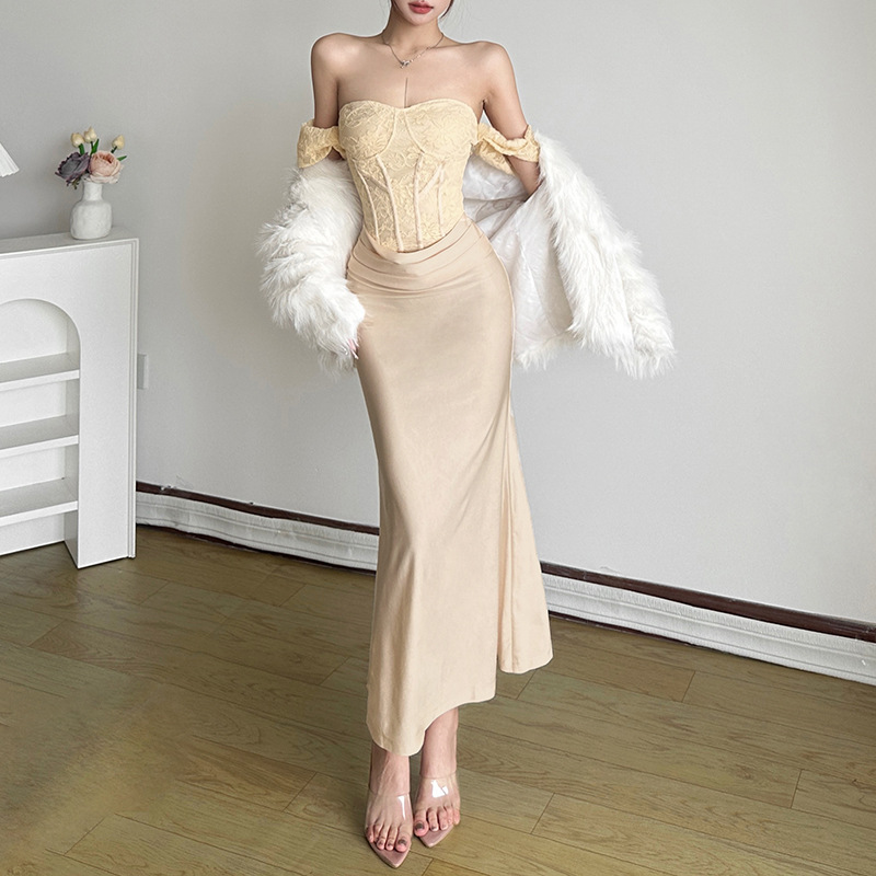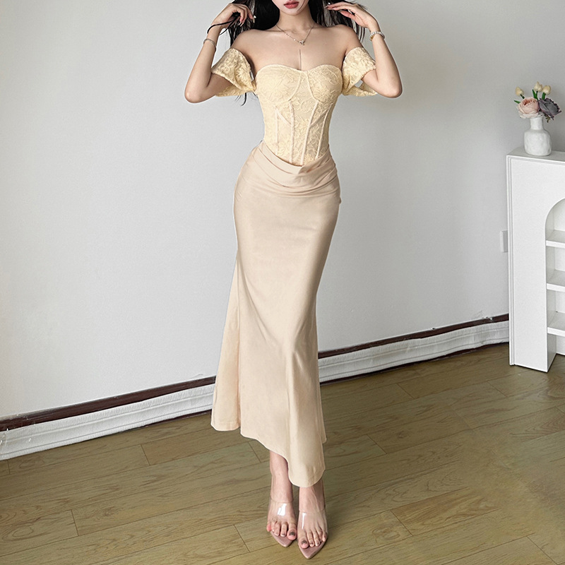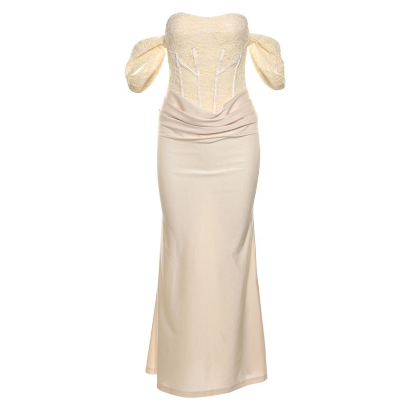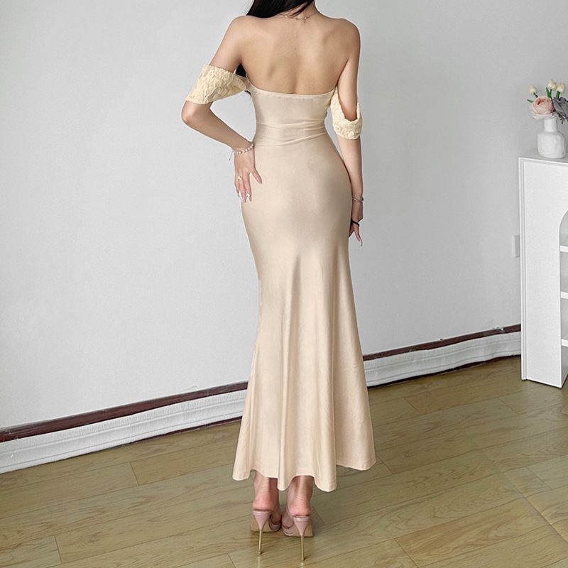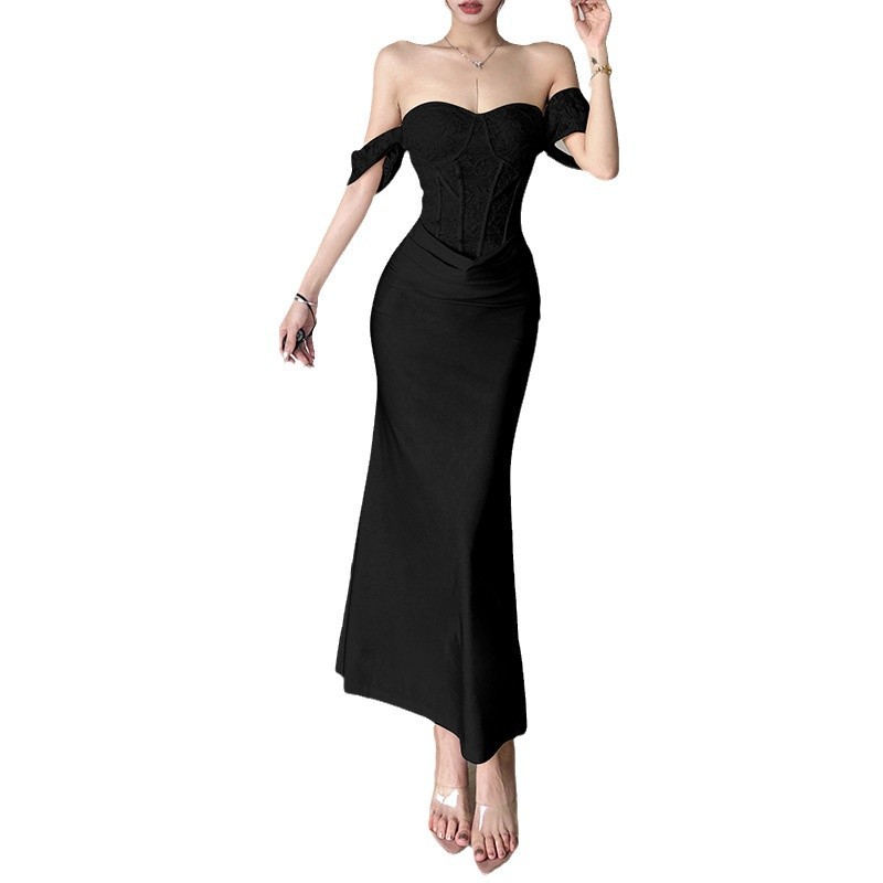 跨境欧美风新款女装优雅晚宴穿搭精致蕾丝肩腰紧身连衣裙