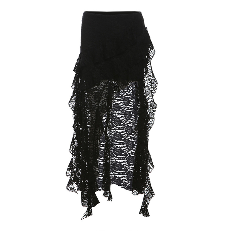 跨境欧美风新款女装独特设计黑色蕾丝波浪褶皱边半身裙