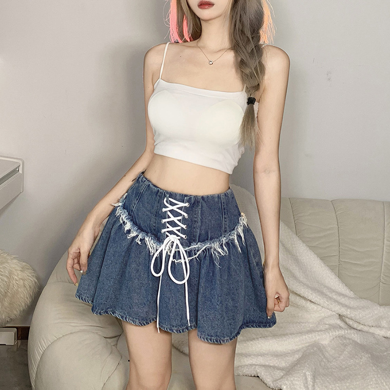 欧美风夏季新款女装时尚性感潮流绑绳收腰流苏荷叶边半身短裙