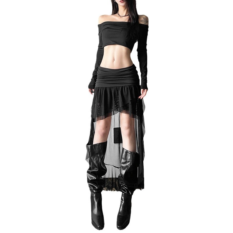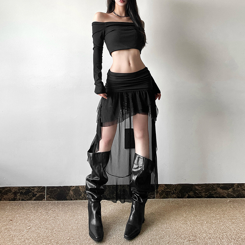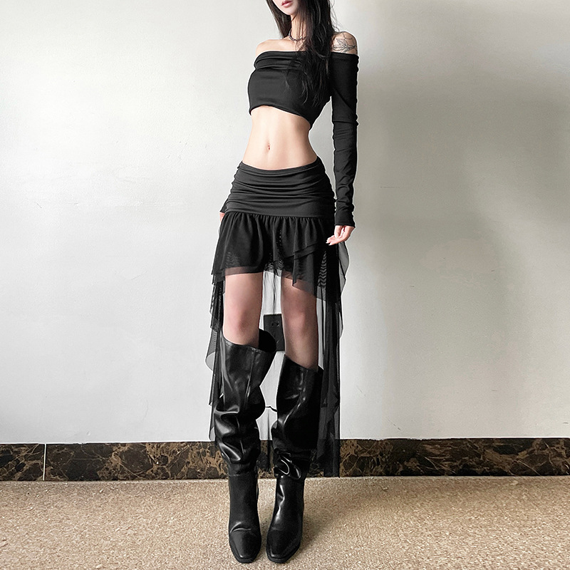 跨境欧美风新款女装轻盈薄纱层叠设计纯黑网纱修身半身裙