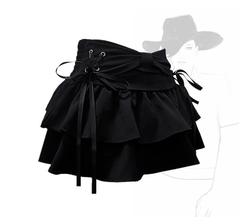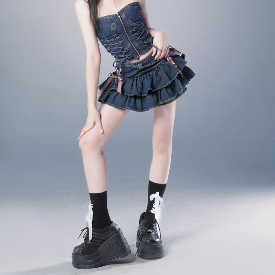 2025春夏新款y2k蓝色牛仔百褶蛋糕裙蝴蝶结复古丝带a字裙辣妹短裙