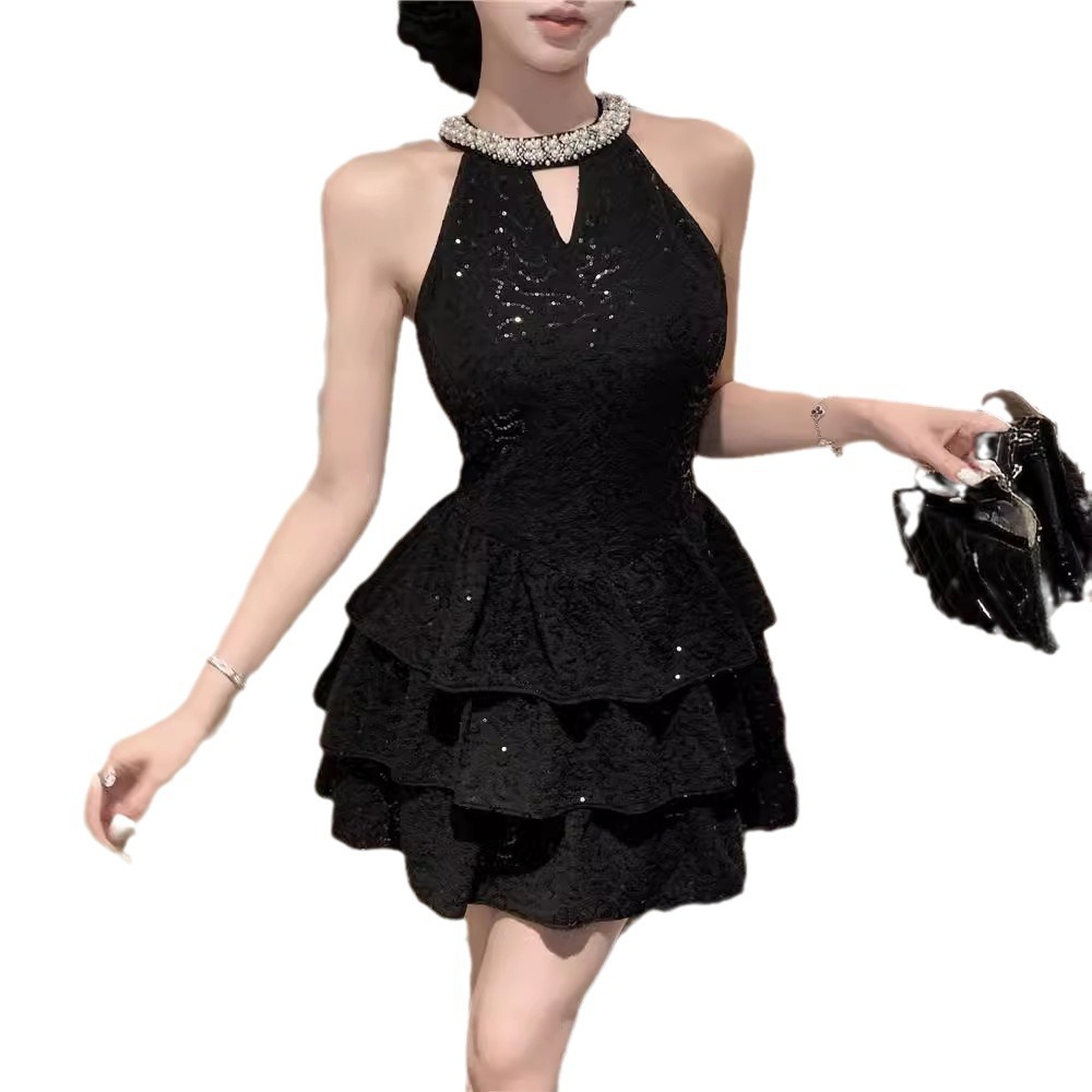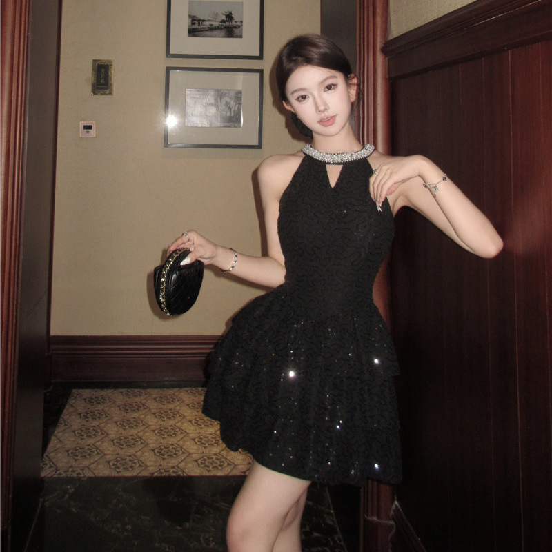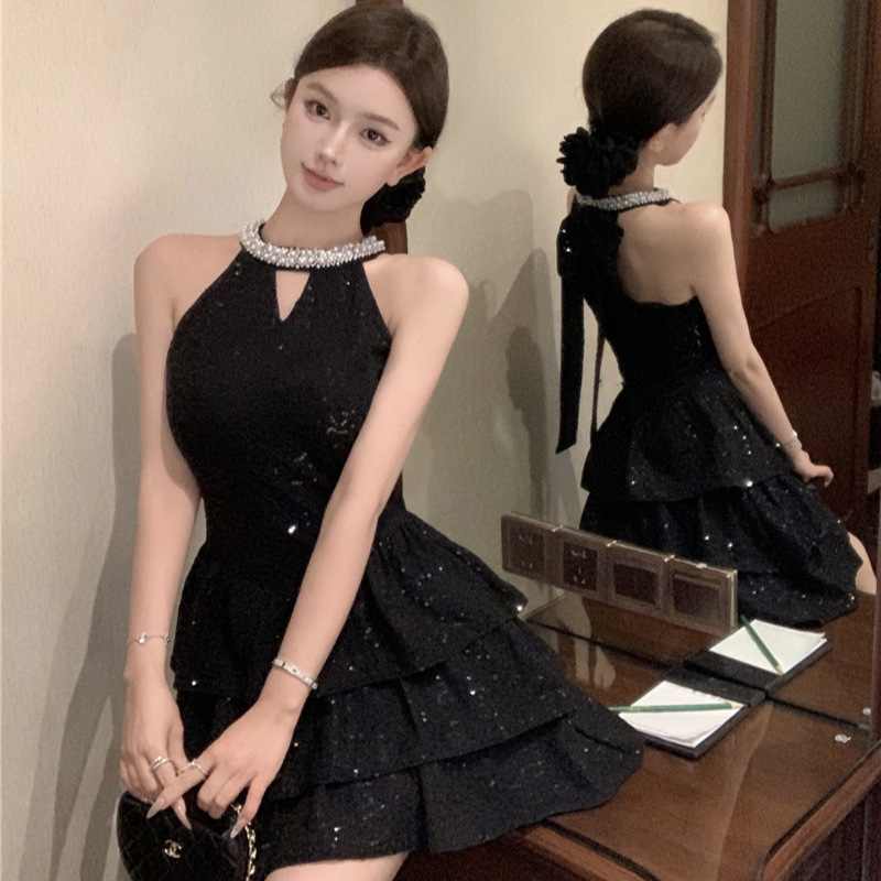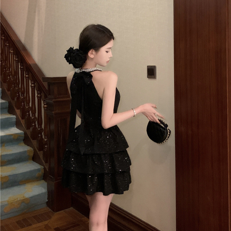 时尚小香风蛋糕裙聚会生日亮片礼服裙镶钻收腰挂脖式连衣裙