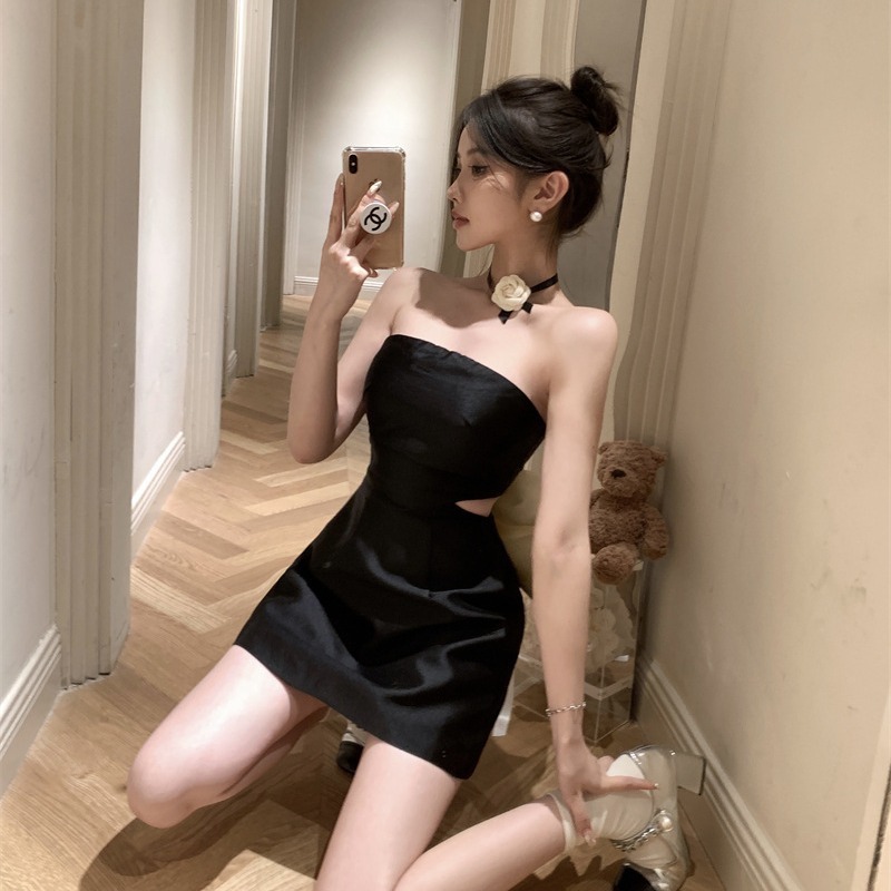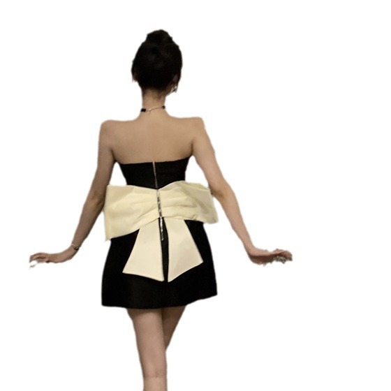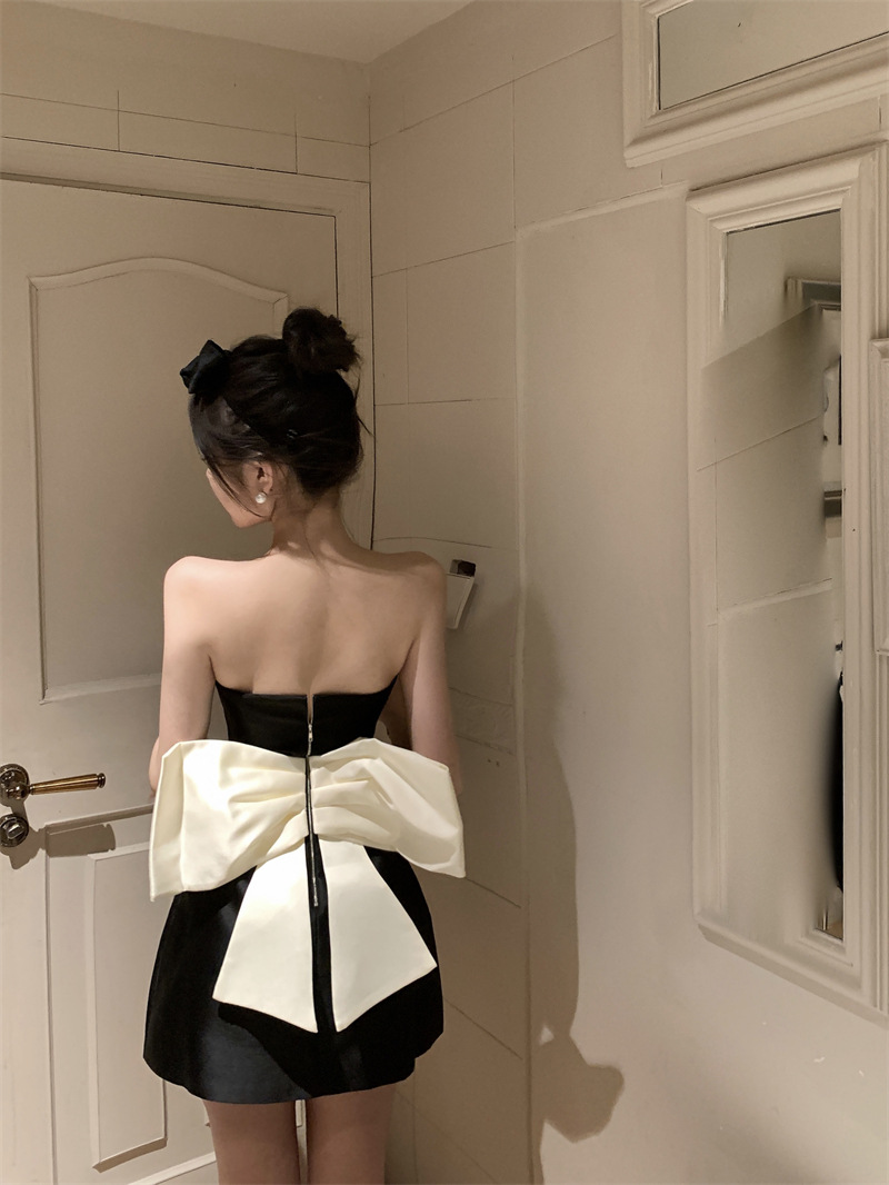 时尚名媛性感小礼服拼接撞色蝴蝶结镂空露腰抹胸连衣裙