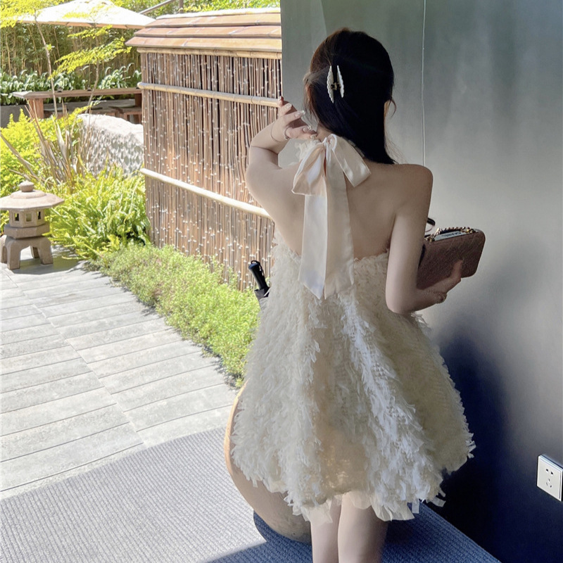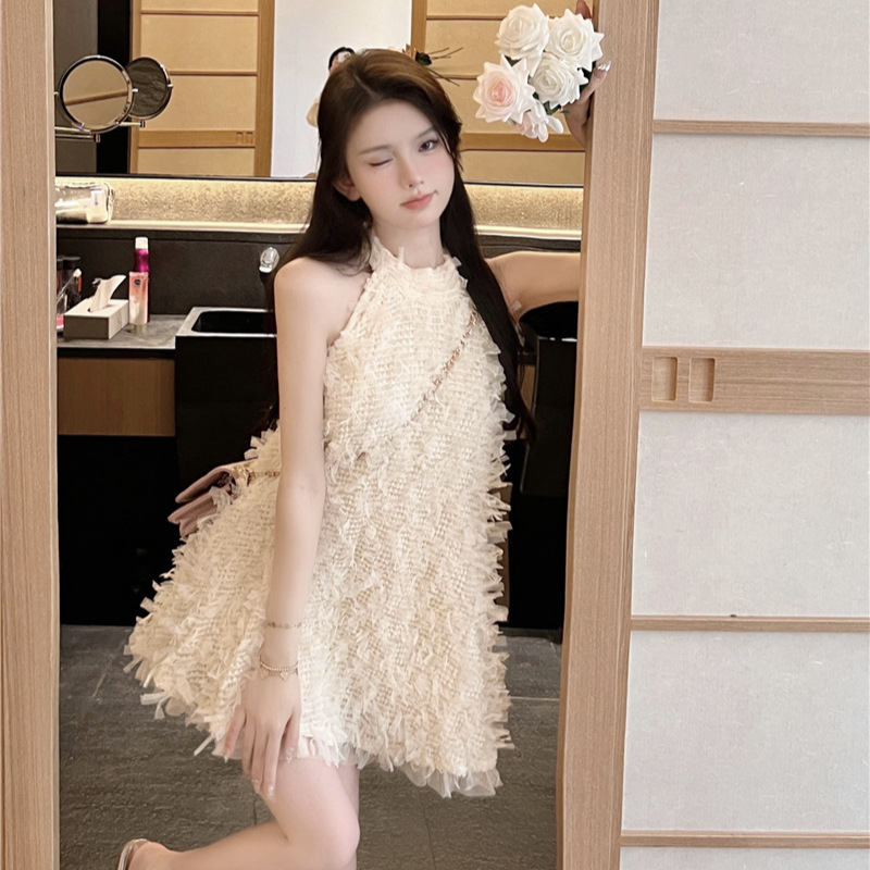 纯欲甜美挂脖连衣裙女夏款性感露背设计感宽松显瘦流苏a字裙