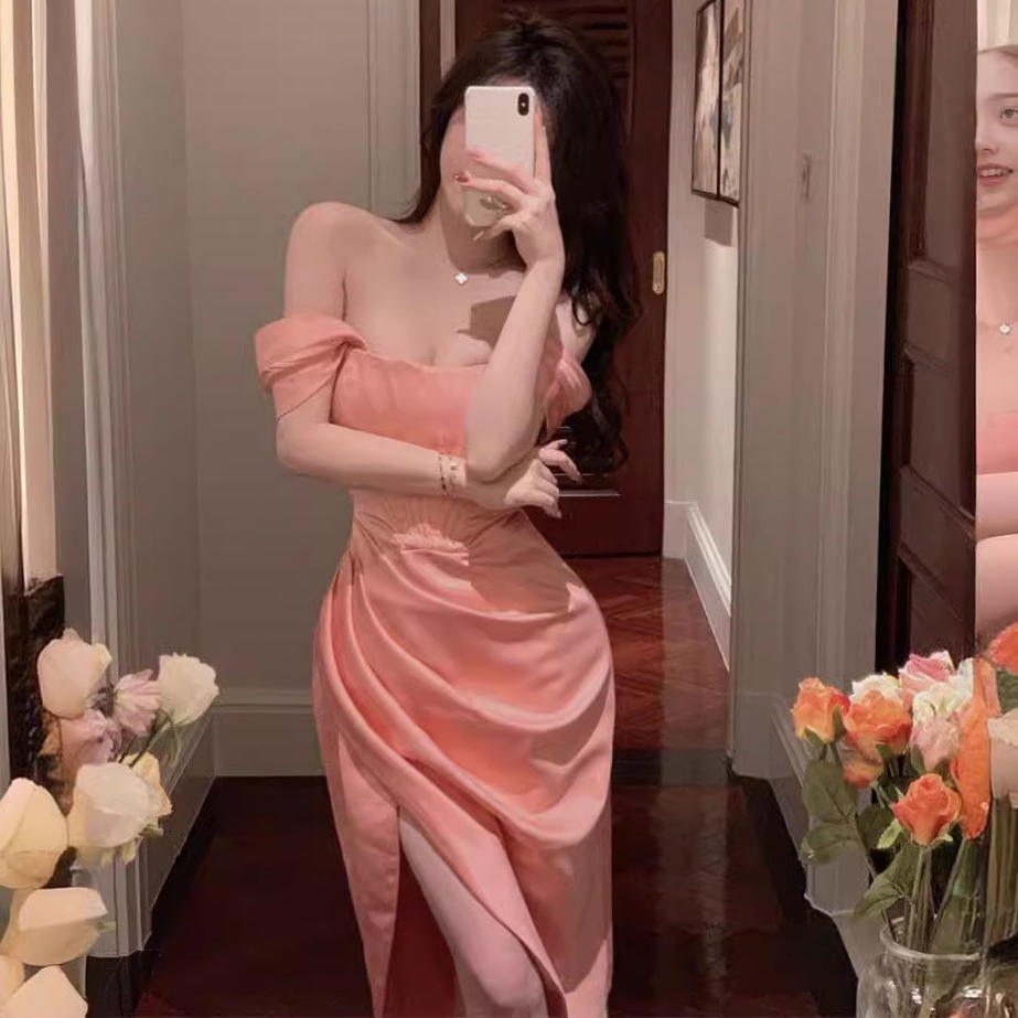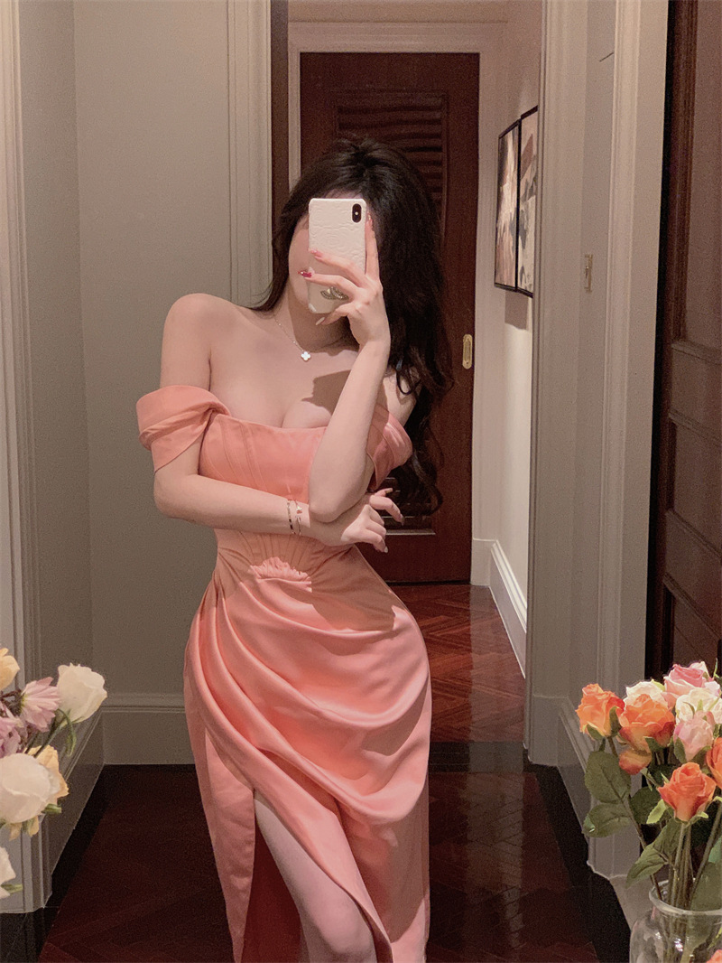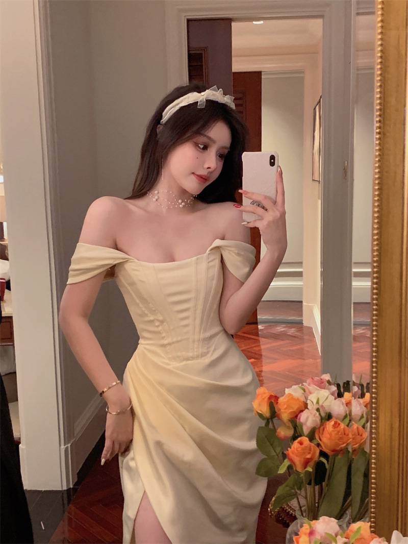 名媛气质女一字领褶肩带鱼骨束腰宫廷显瘦开叉连衣裙礼服裙
