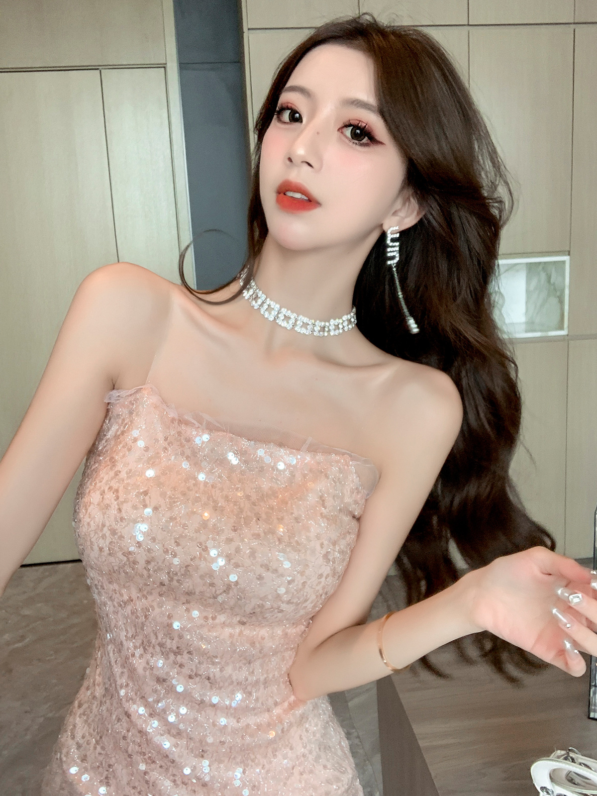 夏纯欲风亮片性感包臀连衣裙修身显瘦甜辣妹抹胸吊带裙裹胸