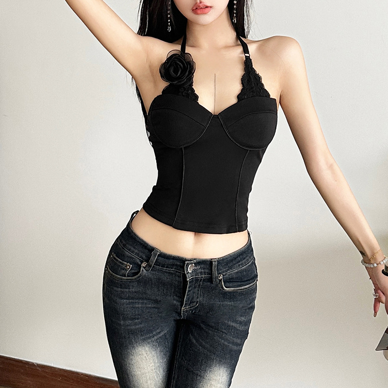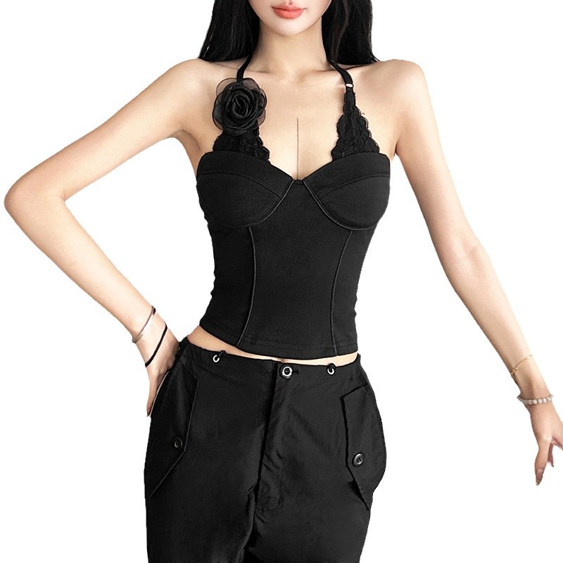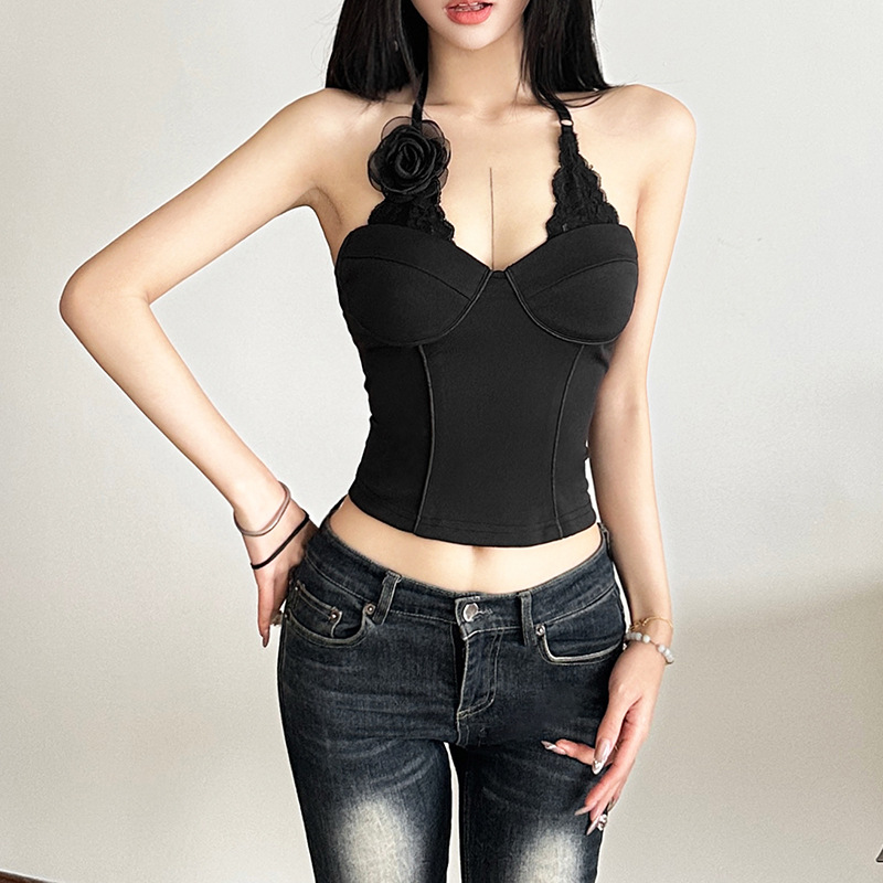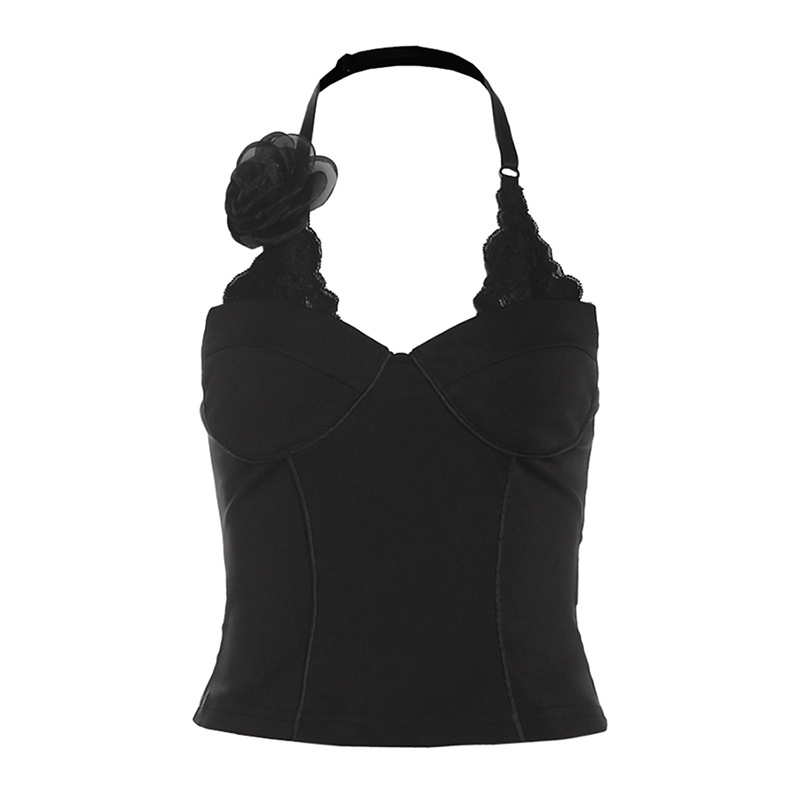 跨境欧美风新款女装优雅黑色蕾丝风情独特大花朵装饰上衣