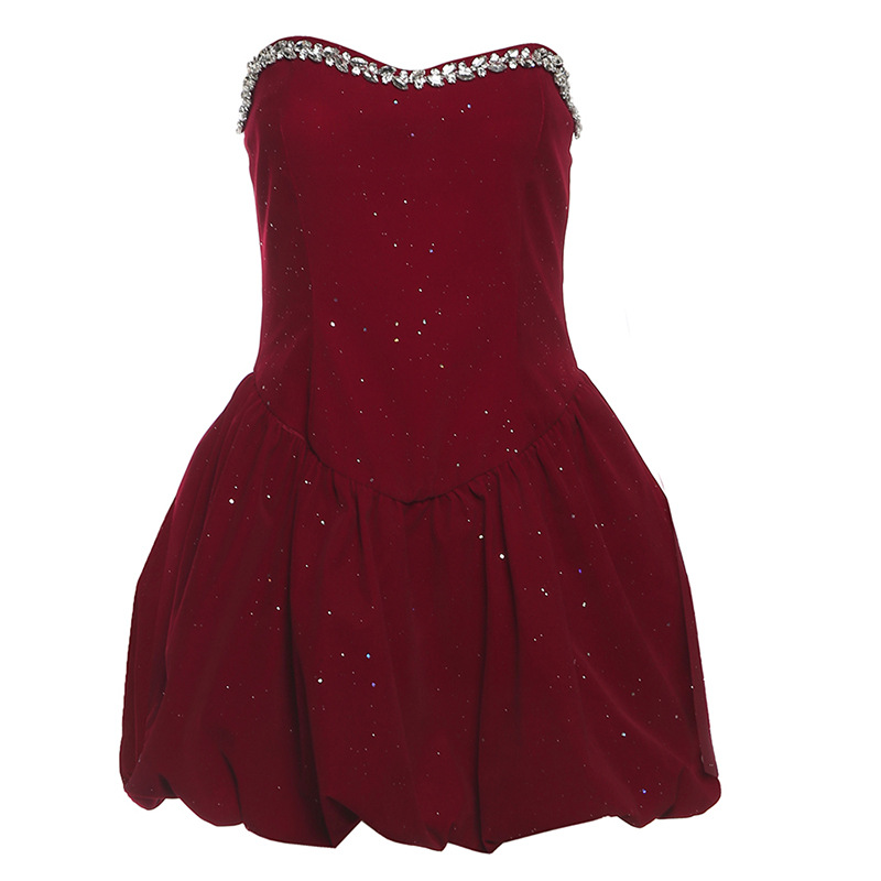 跨境欧美风新款女装优雅时尚无肩带点缀亮片蓬蓬裙连衣裙