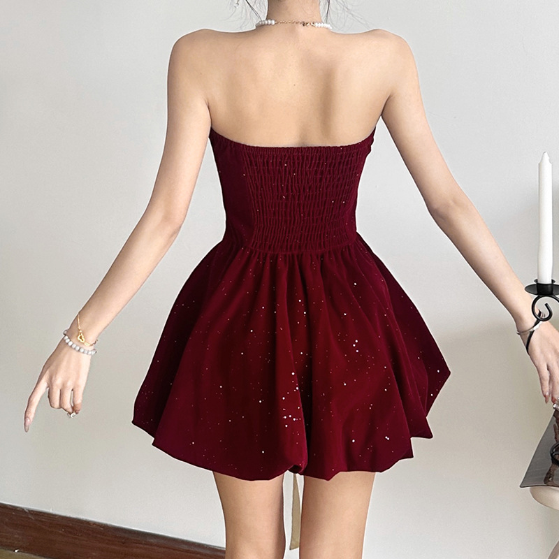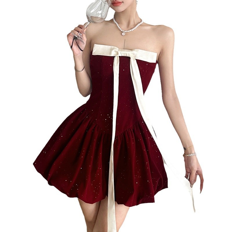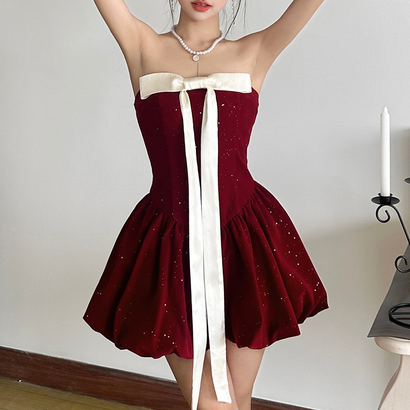 跨境欧美风新款女装一字领抹胸时尚高腰蝴蝶结修身连衣裙