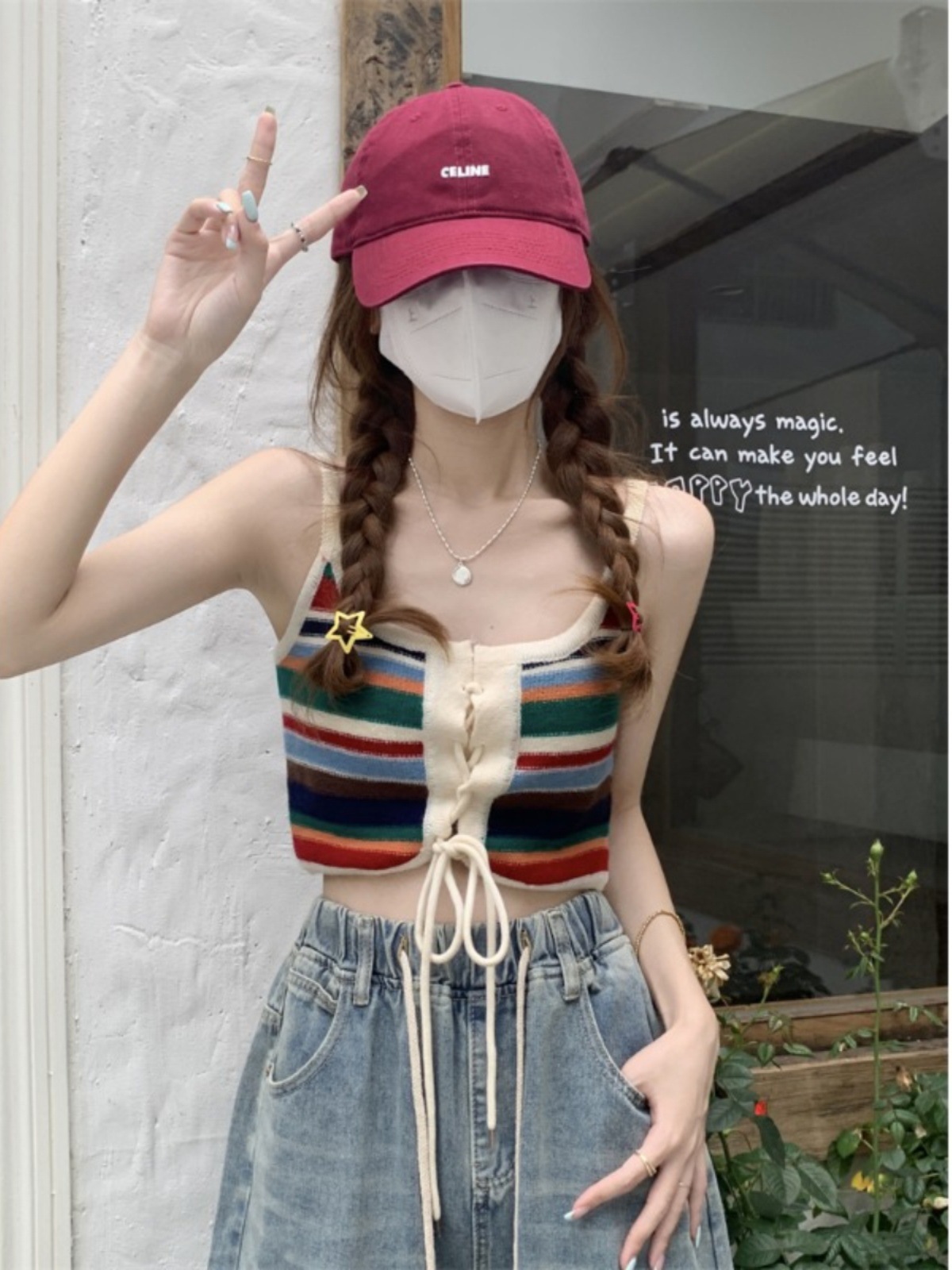 彩色条纹小吊带背心女夏无袖外穿美背坎肩遮副乳设计感多巴胺上衣