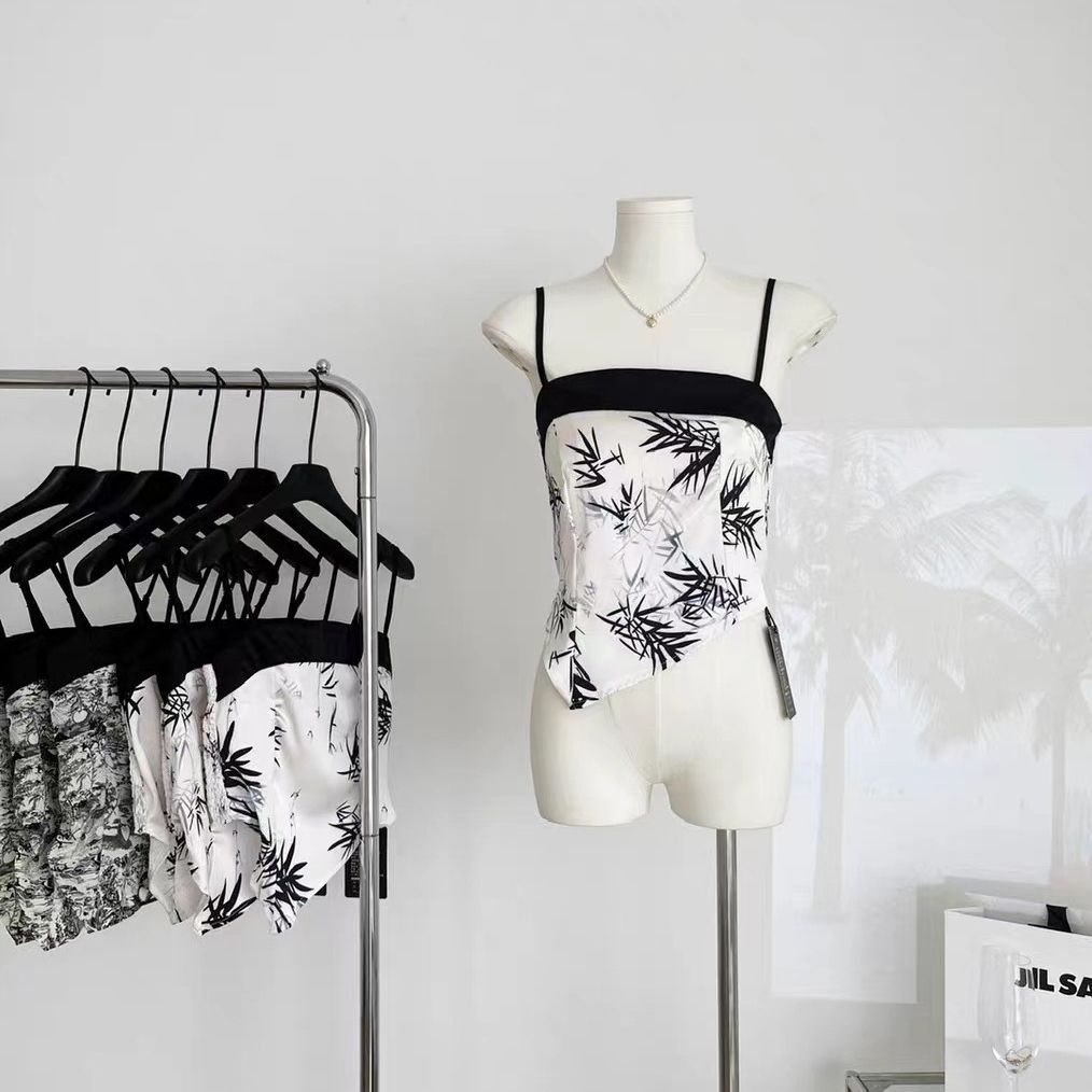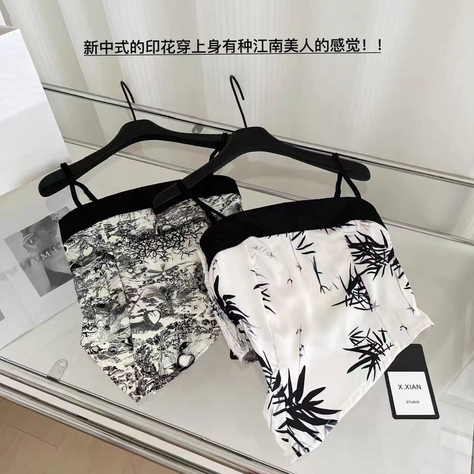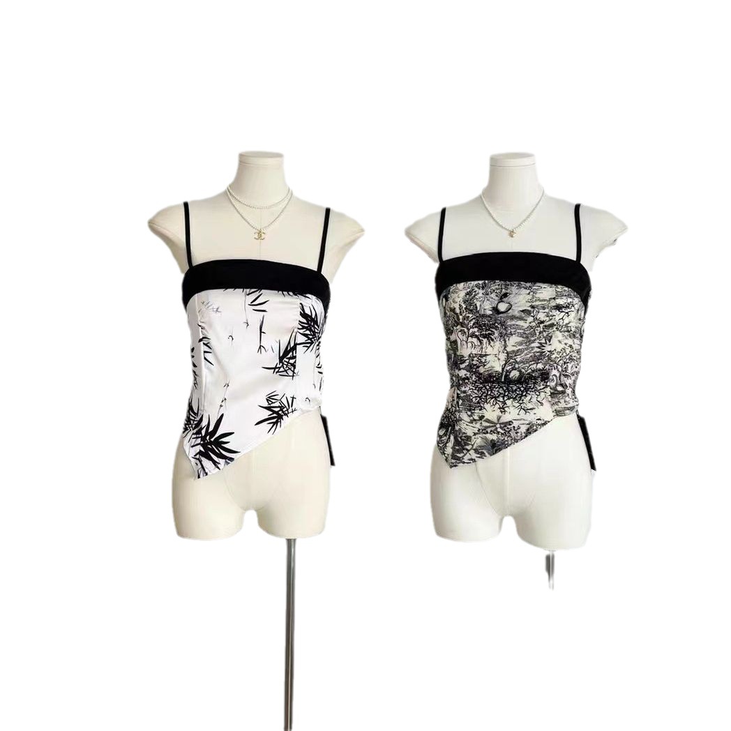 盘扣装饰复古印花吊带女修身短款美背春夏西装内搭新中式背心
