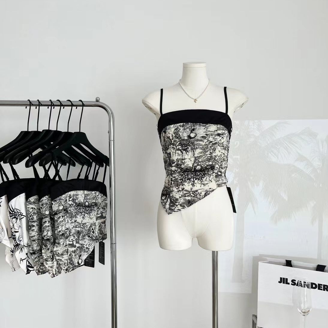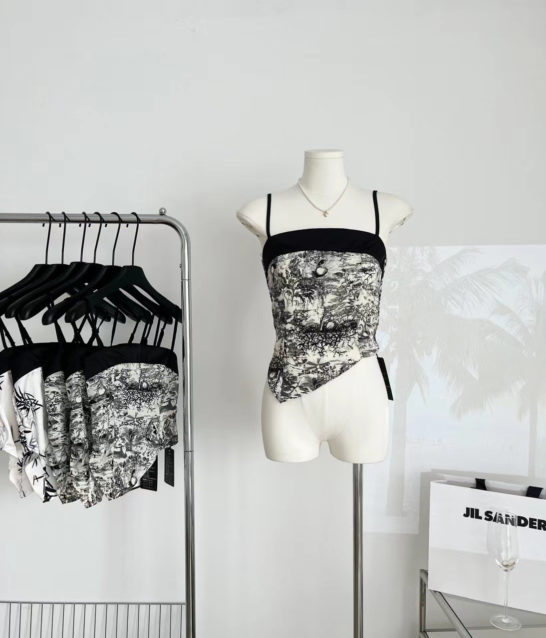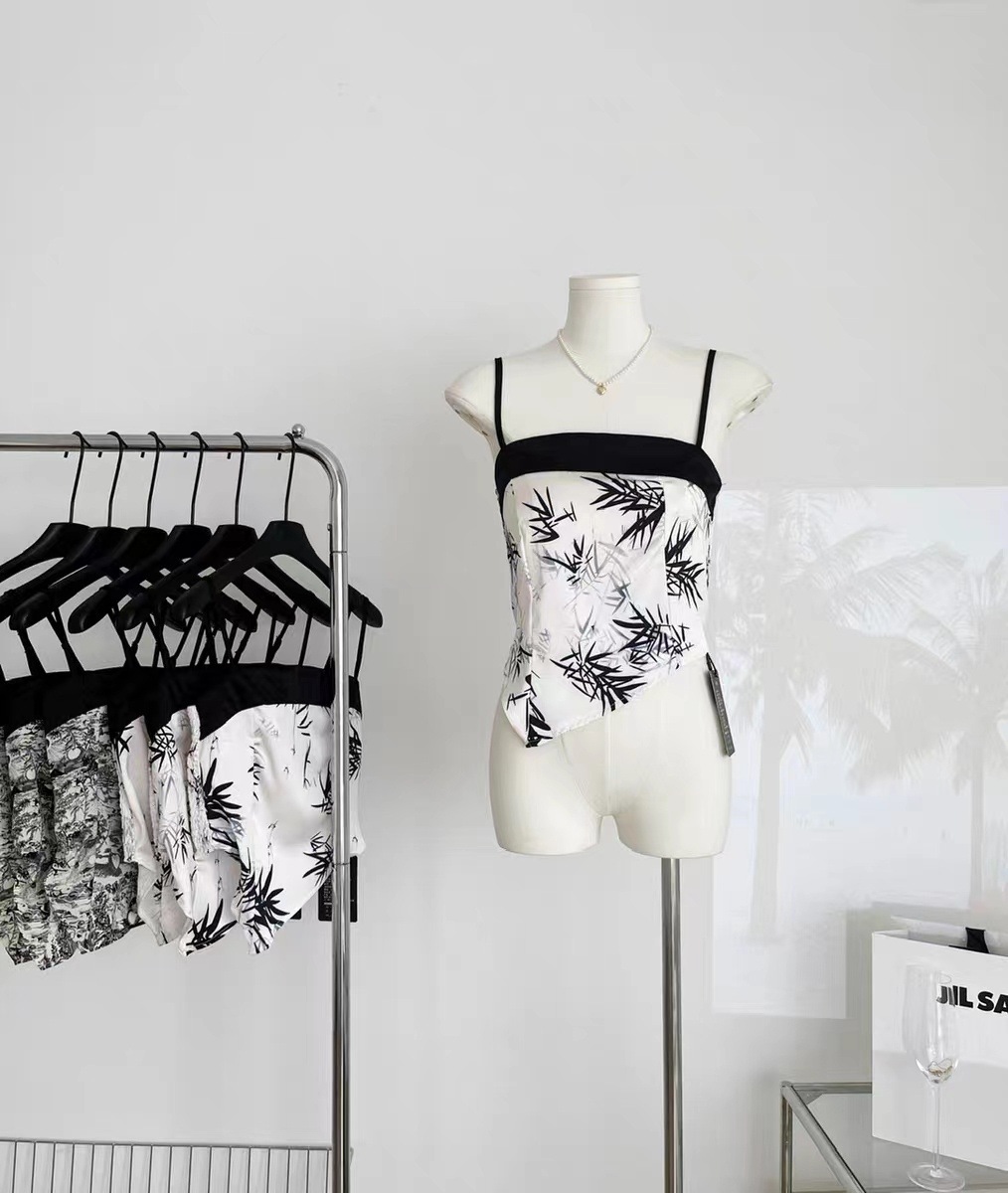 盘扣装饰复古印花吊带女修身短款美背春夏西装内搭新中式背心