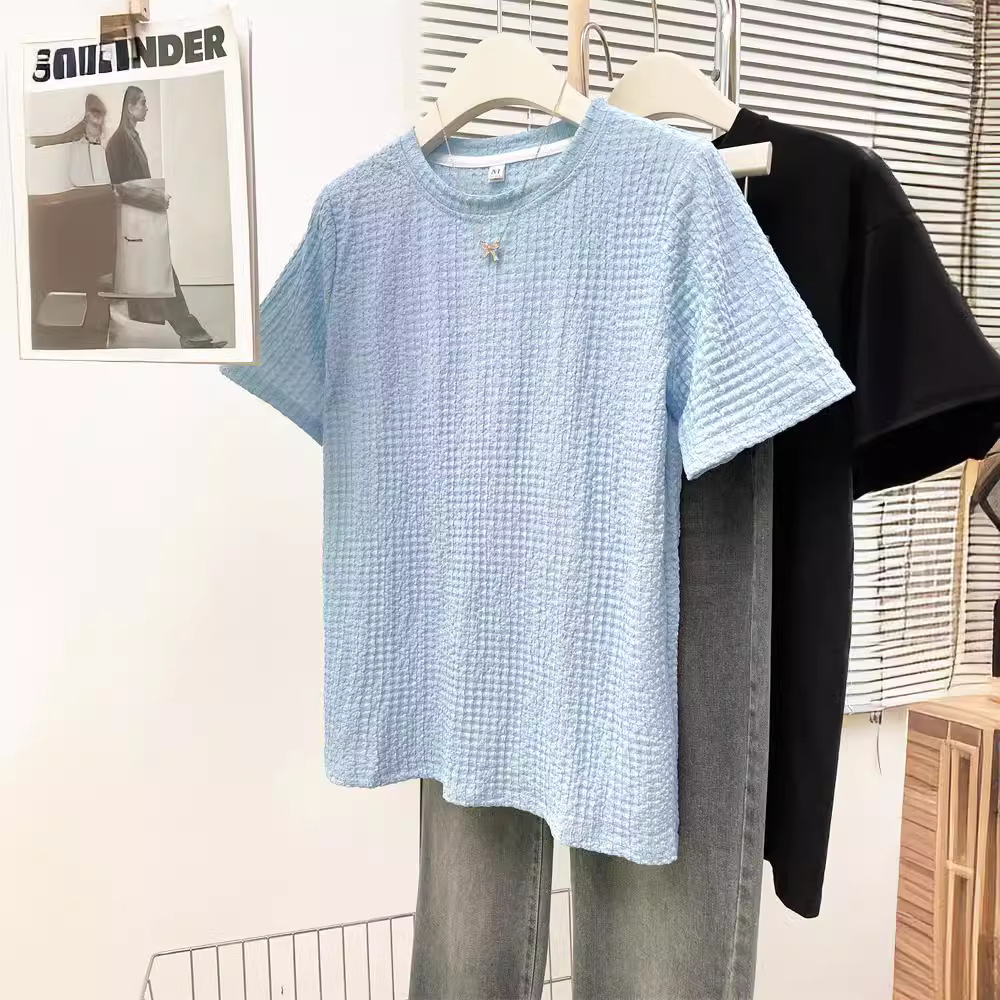 韩版夏季新款宽松洋气减龄百搭半袖打底衫女小众别致提花短袖T恤
