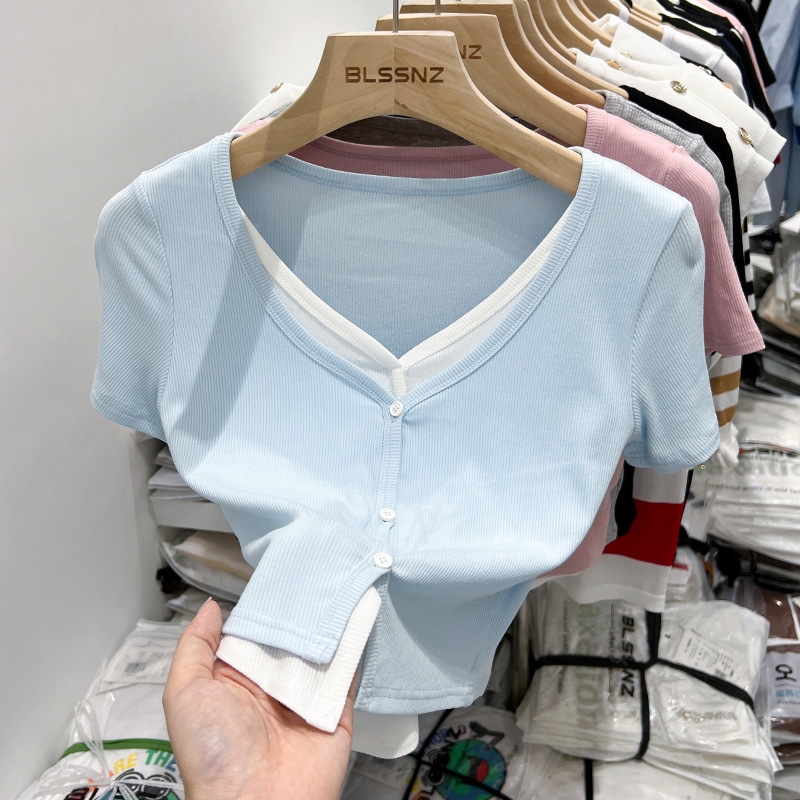 v领短袖t恤女修身设计感小众夏季别致假两件甜辣短款上衣半袖体恤