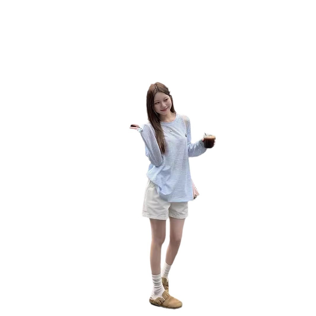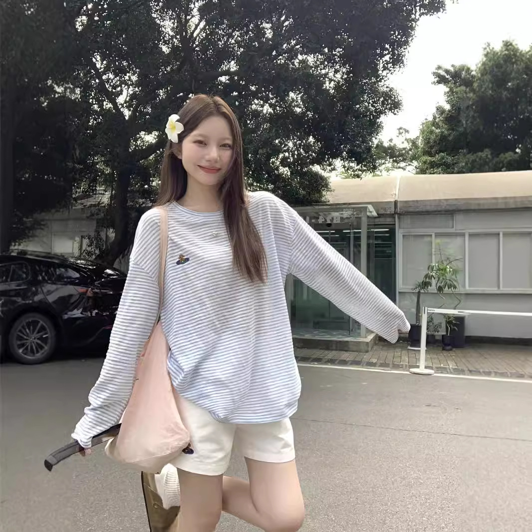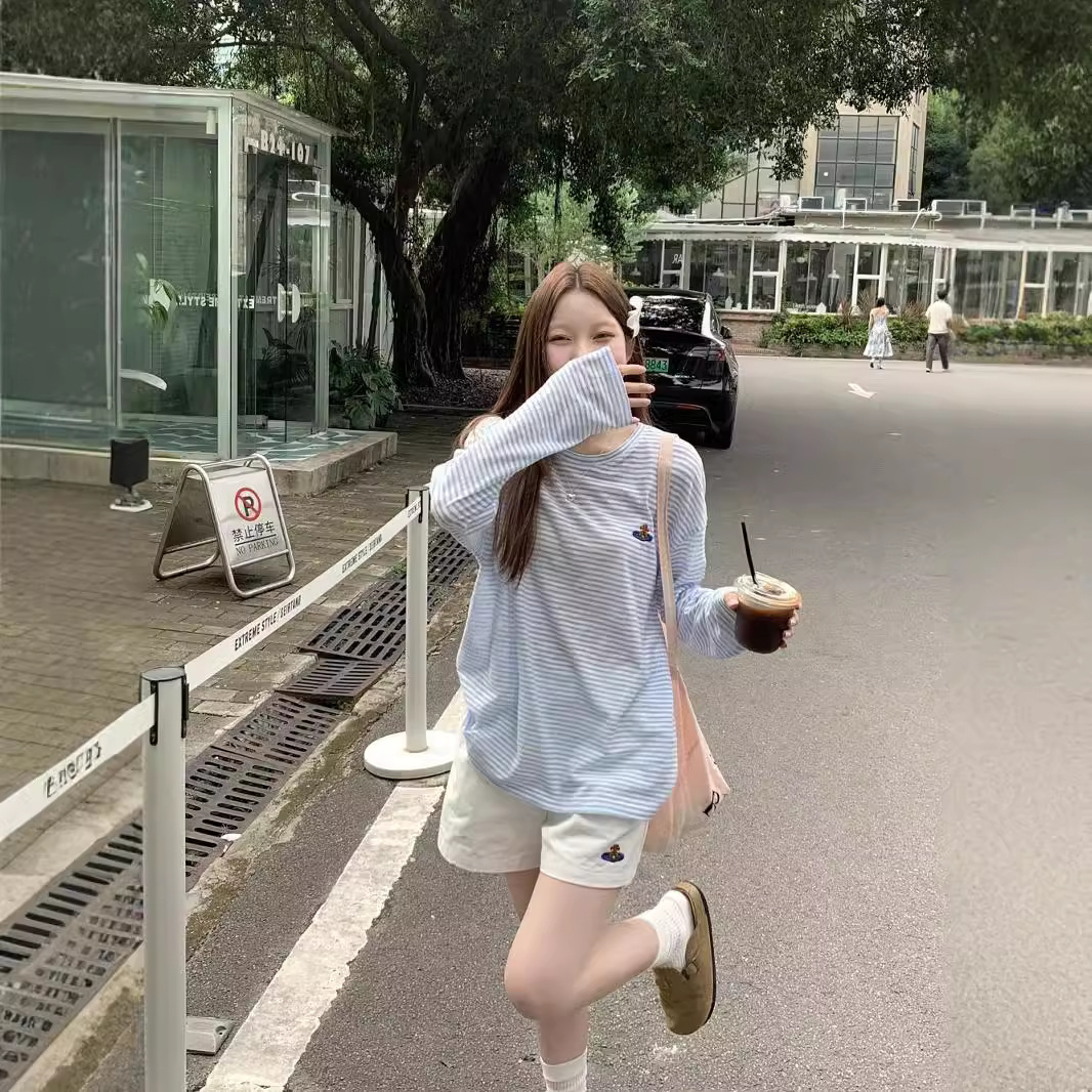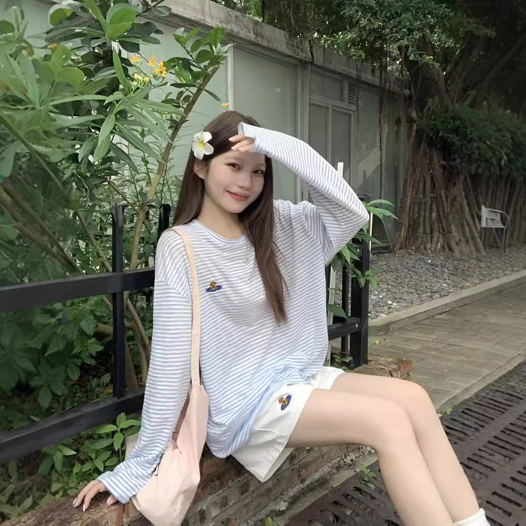 小清新条纹长袖防晒T恤女装夏季新款刺绣宽松中长款薄款罩衫上衣