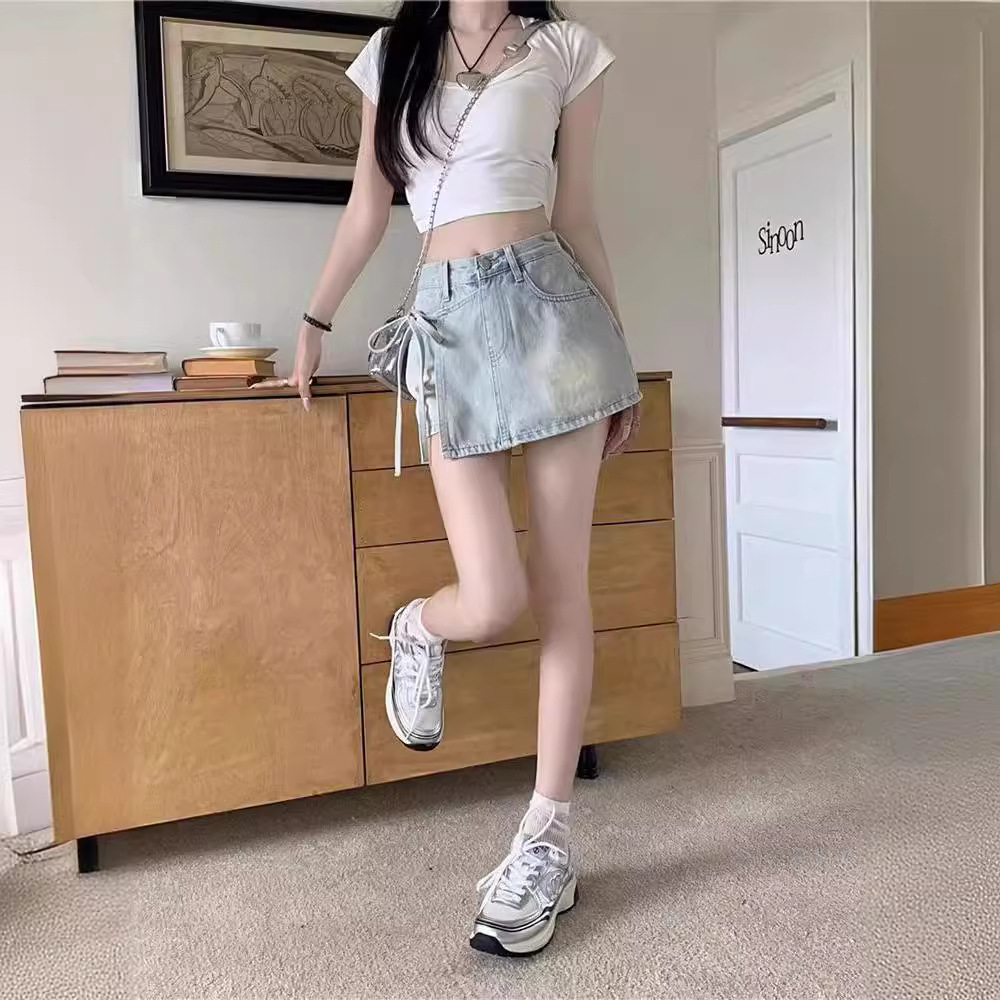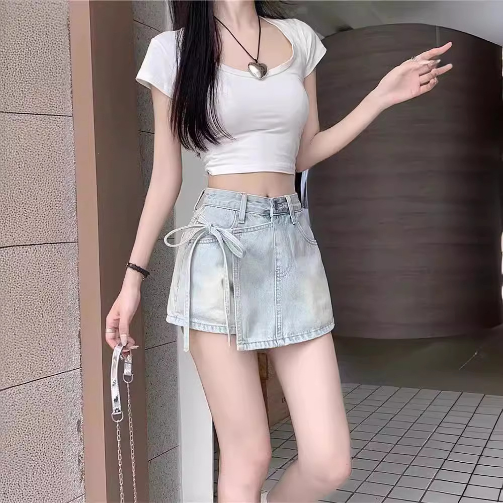 假两件牛仔短款女夏季A字高腰不规则洋气绑带裙裤小个子辣妹裤子