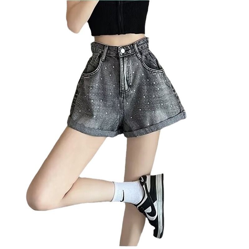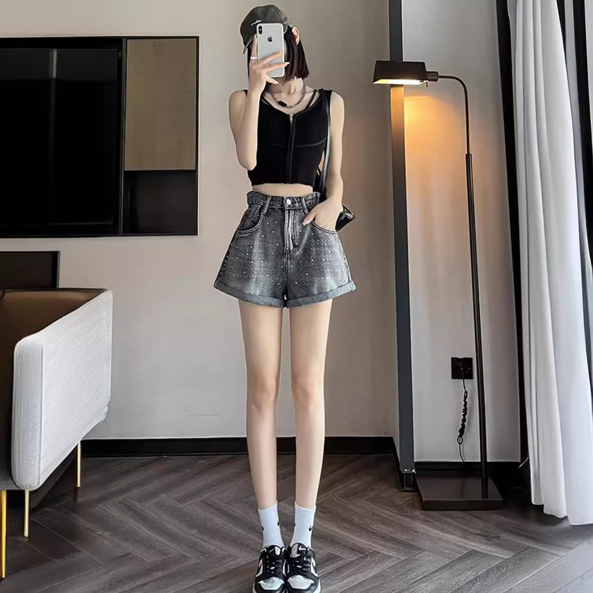 重工烫钻卷边高腰牛仔短款女2025夏季新款高腰显瘦a字阔腿热裤