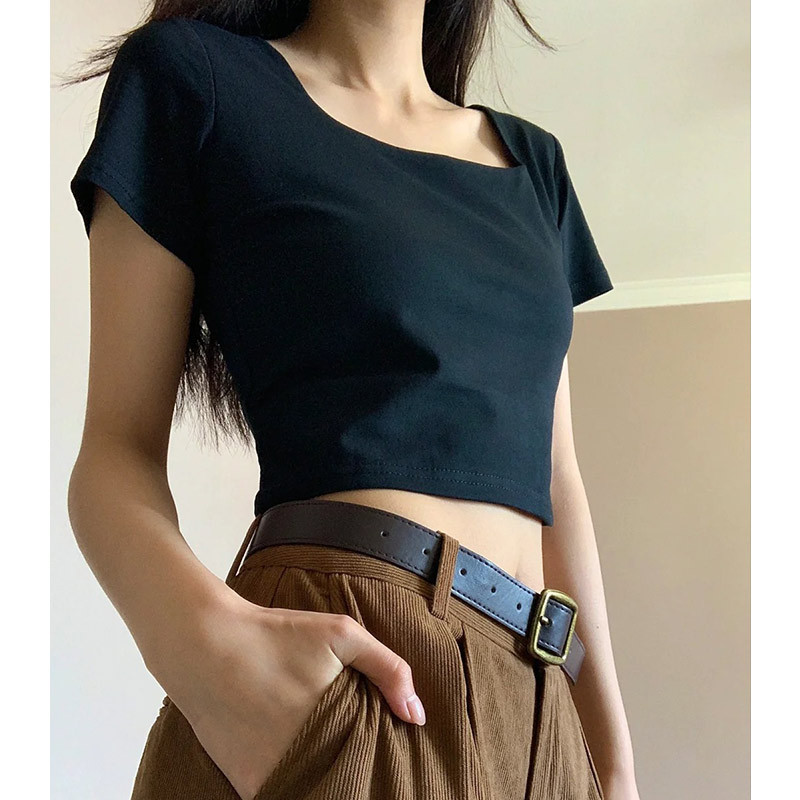 纯欲T恤方领短款女春夏新款修身白色短袖方领内搭打底衫上衣