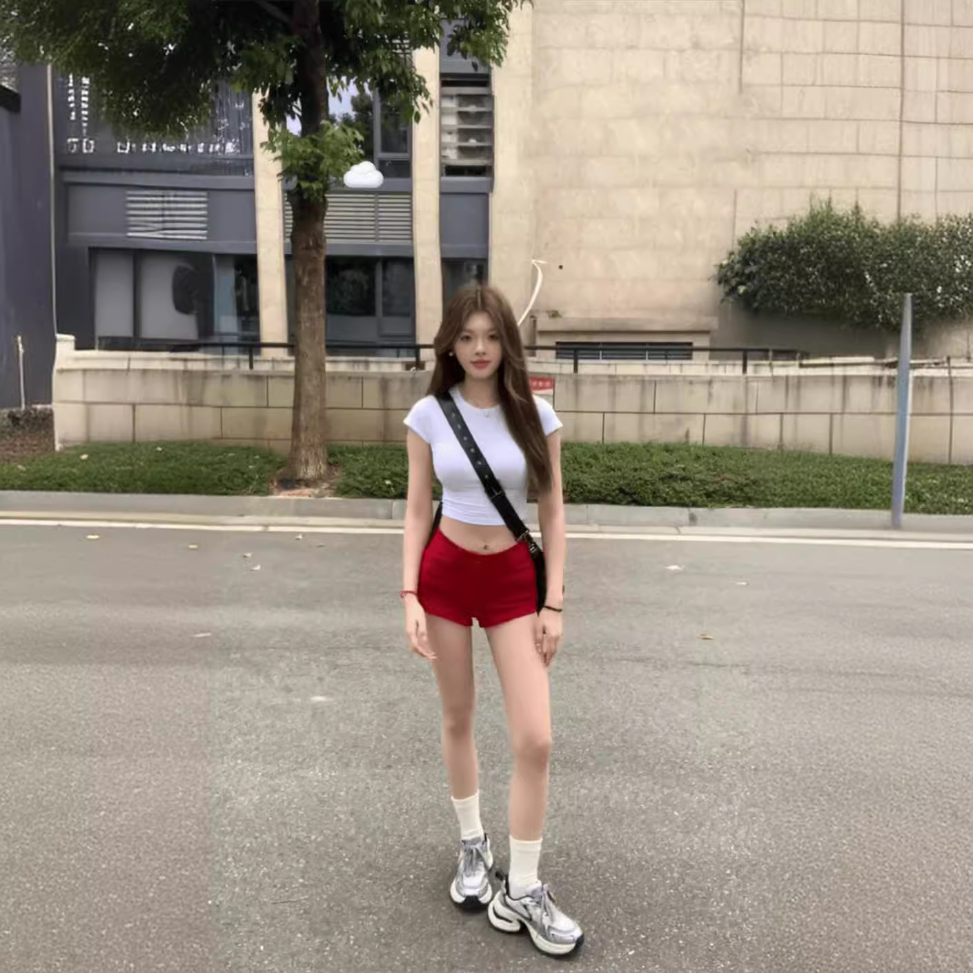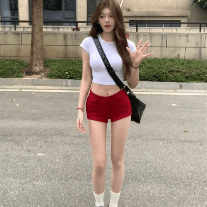 红色辣妹牛仔短裤女夏季新款美式复古高腰直筒显瘦外穿包臀热裤子