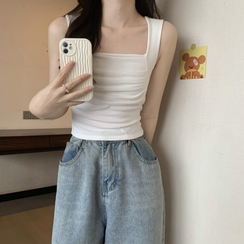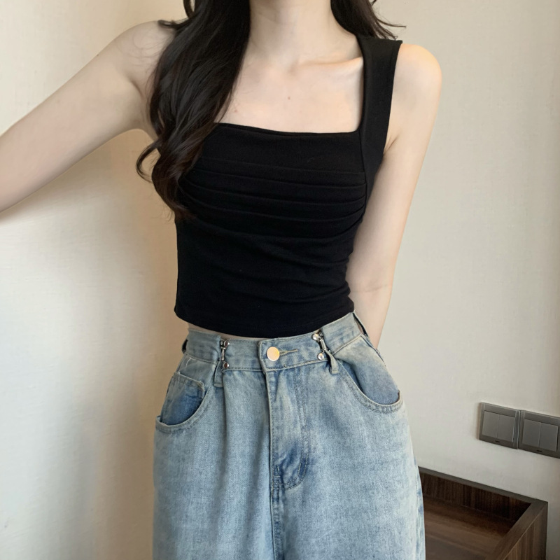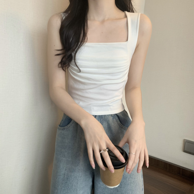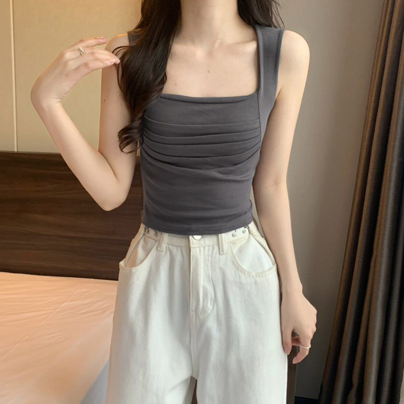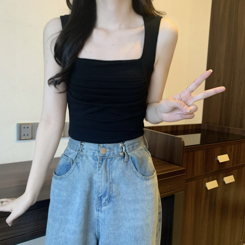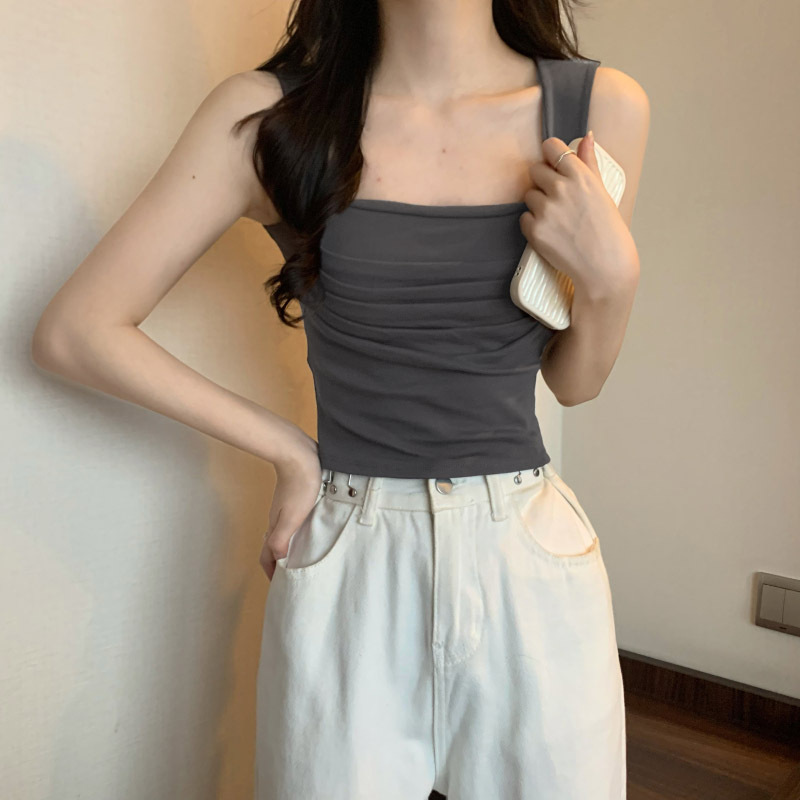 法式方领螺纹带胸垫辣妹褶皱宽肩带遮肉吊带打底衫显瘦甜辣风背心