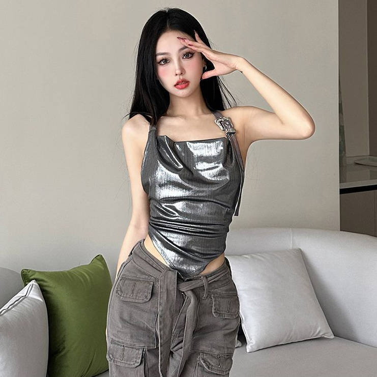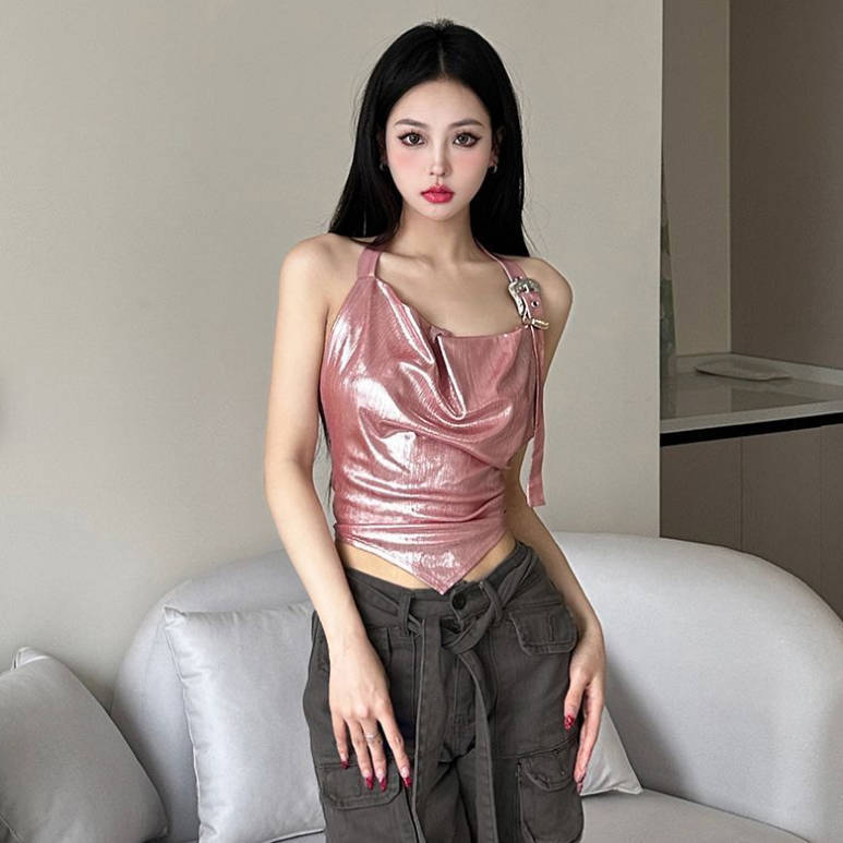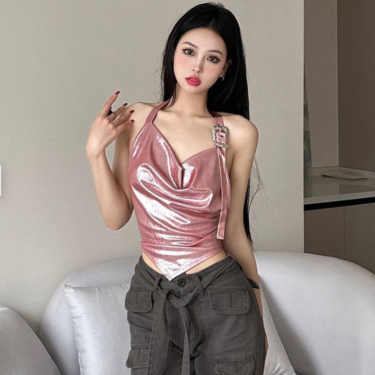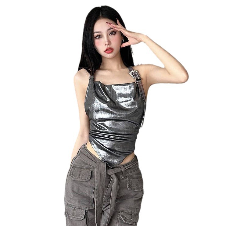 欧美酷飒御姐挂脖式吊带女亮面褶皱设计感辣妹短款背心性感上衣