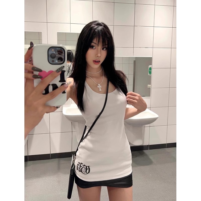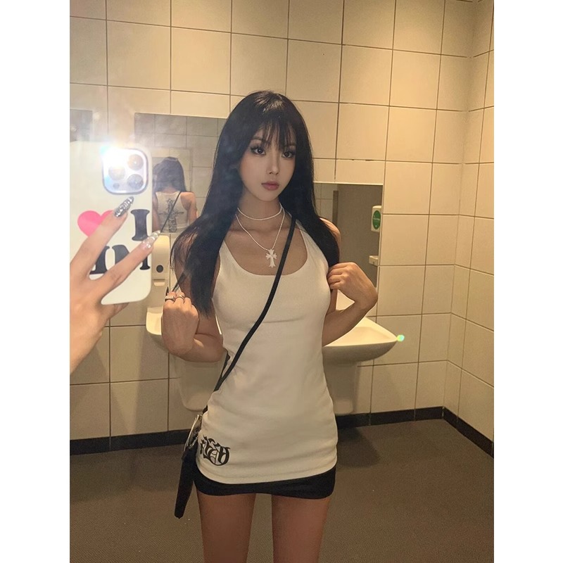 弹力纯欲高街辣妹白色字母背心女夏季感名媛气质休闲百搭无袖上衣