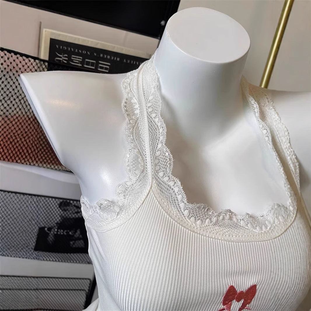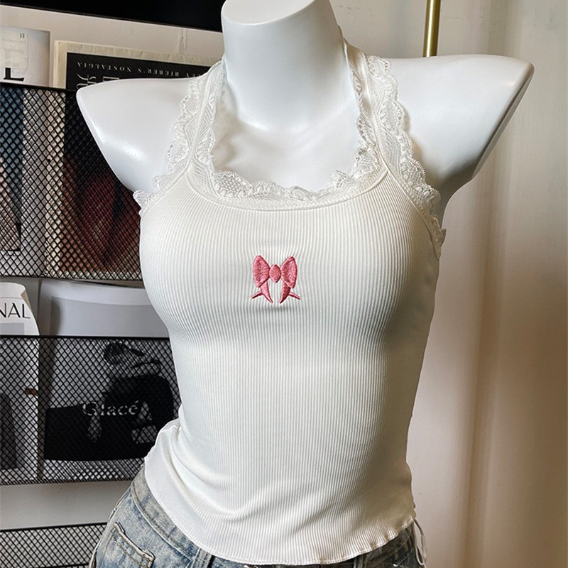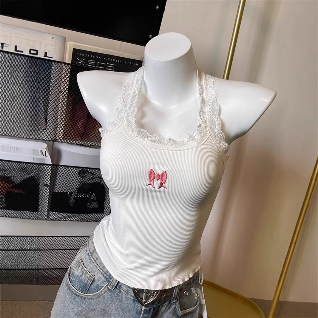 奶白色挂脖背心女纯欲风夏季蝴蝶结刺绣露背修身木耳边打底小背心