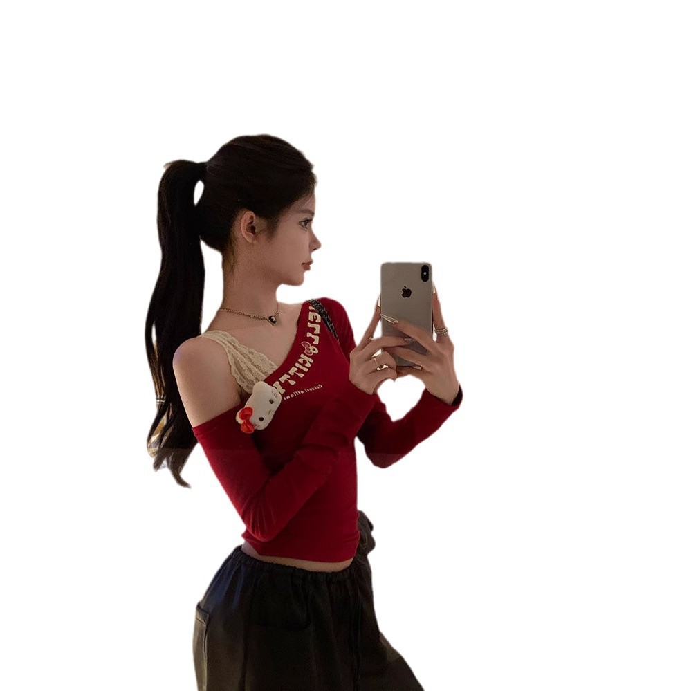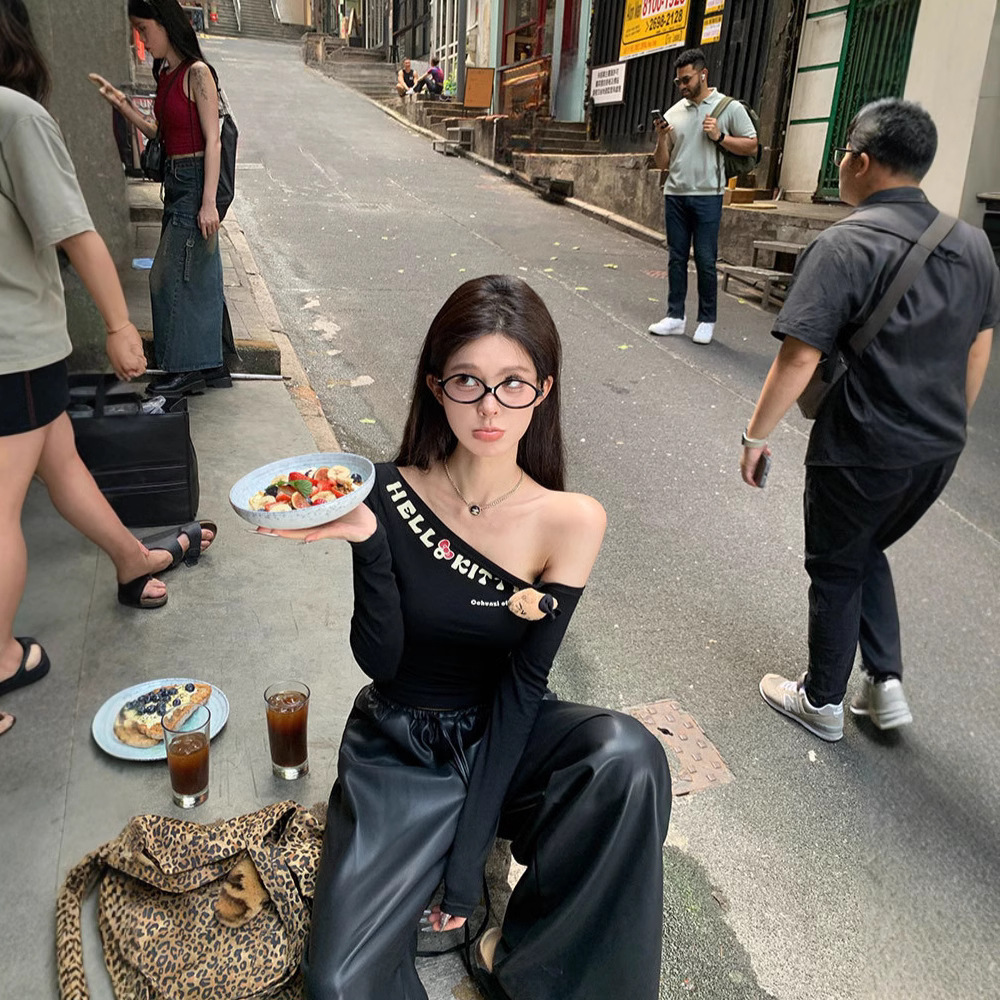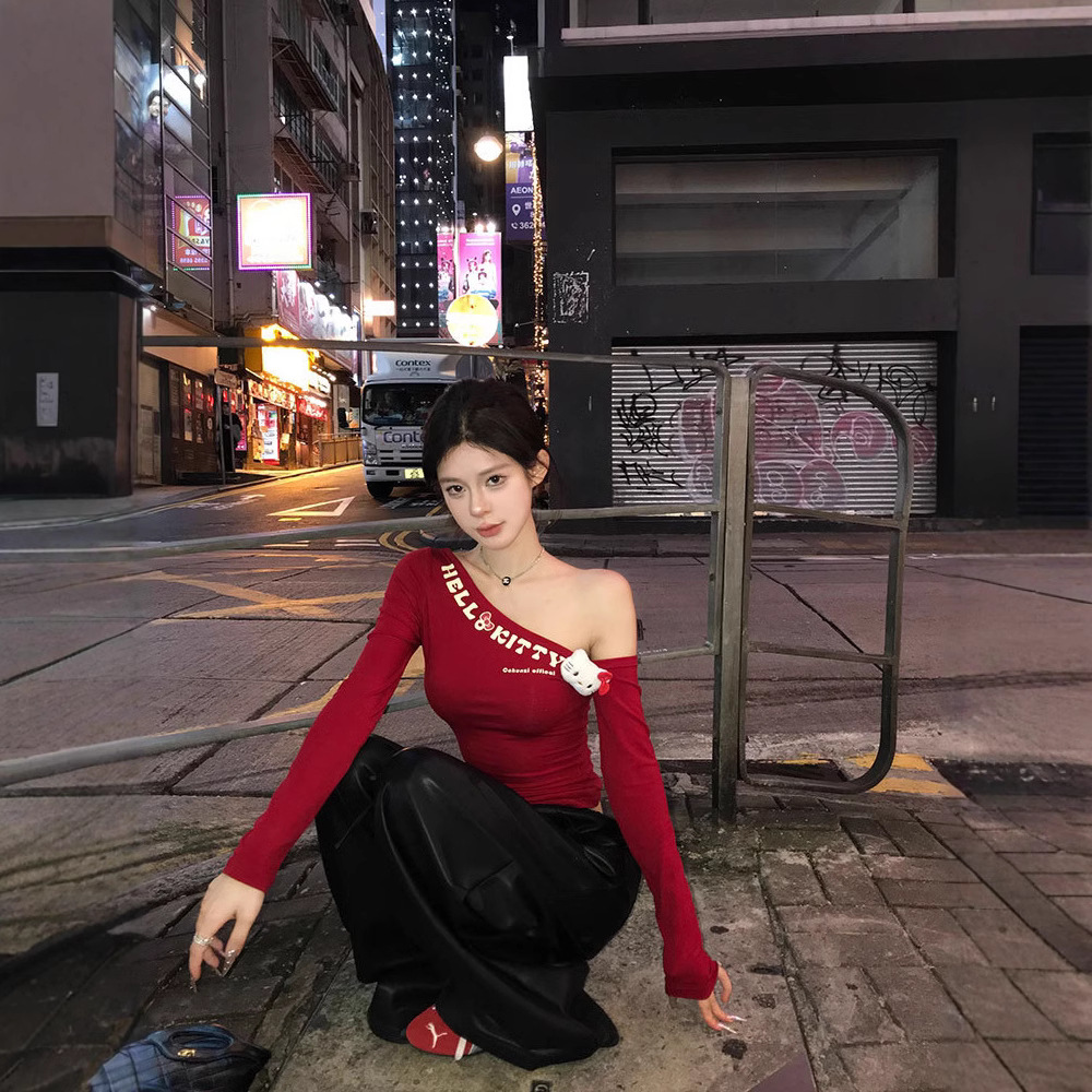 2025秋季新款辣妹字母印花斜肩T恤立体猫咪装饰修身长袖露肩上衣
