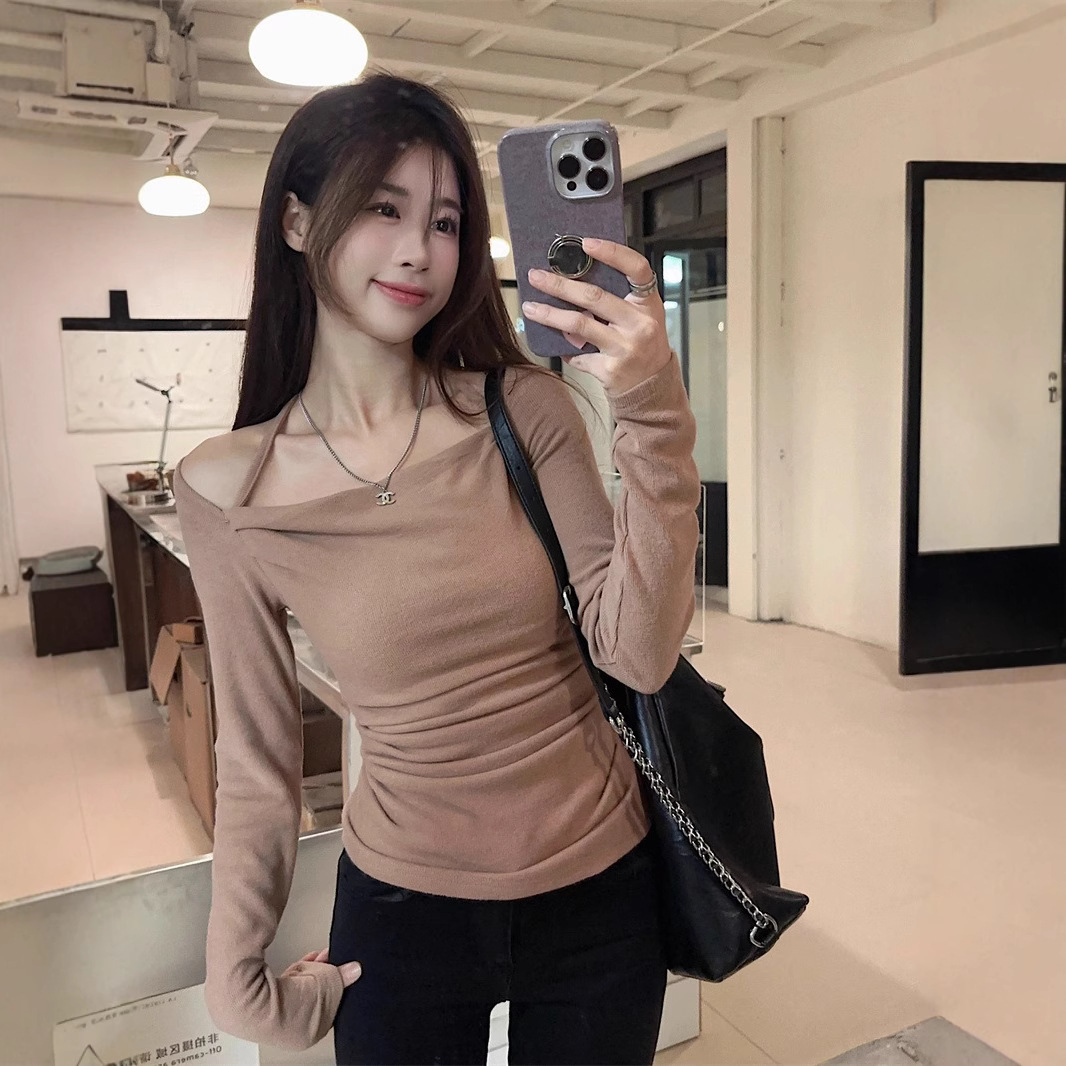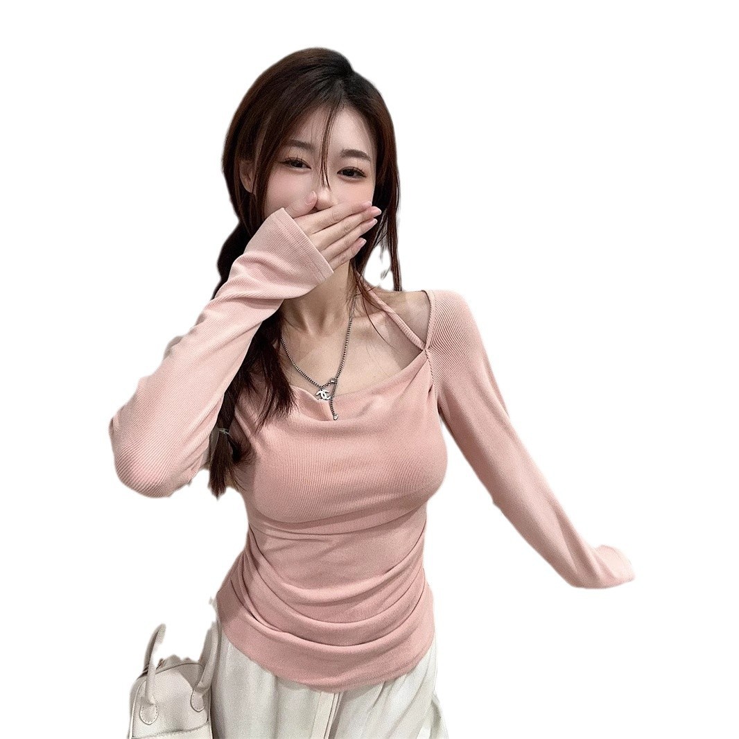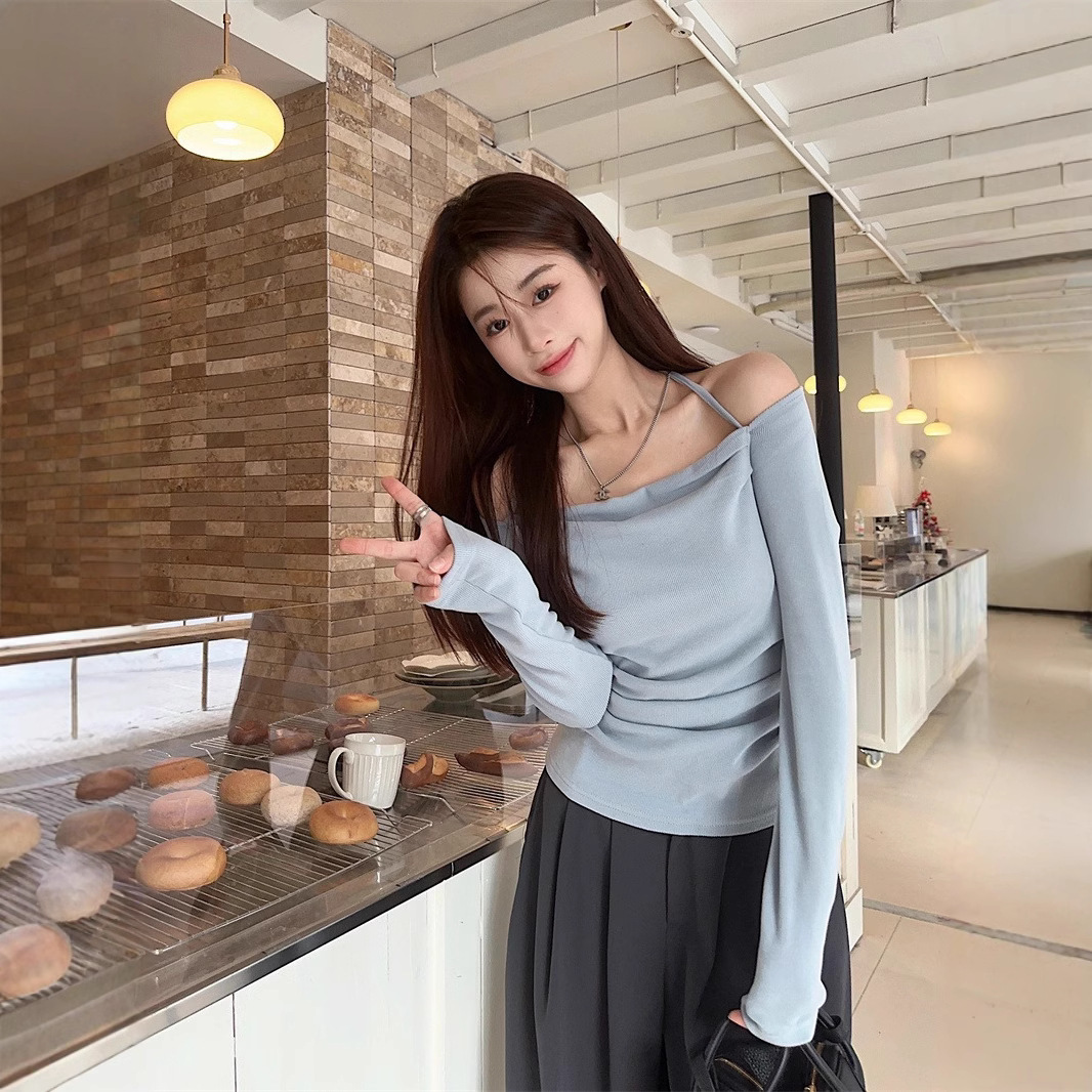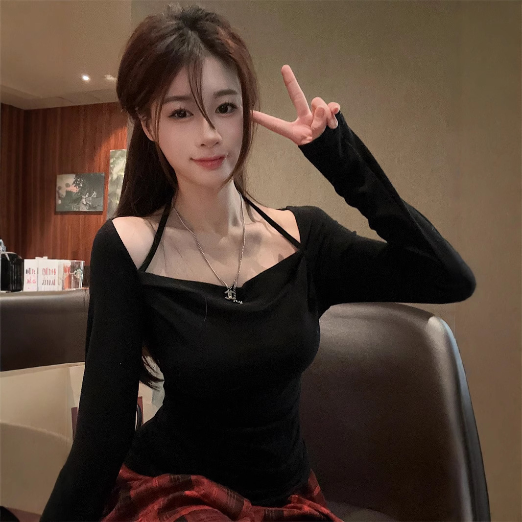 荡领挂脖露锁骨长袖T恤女2025秋季新款甜美风修身内搭短款上衣ins