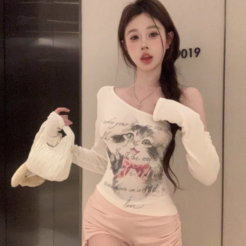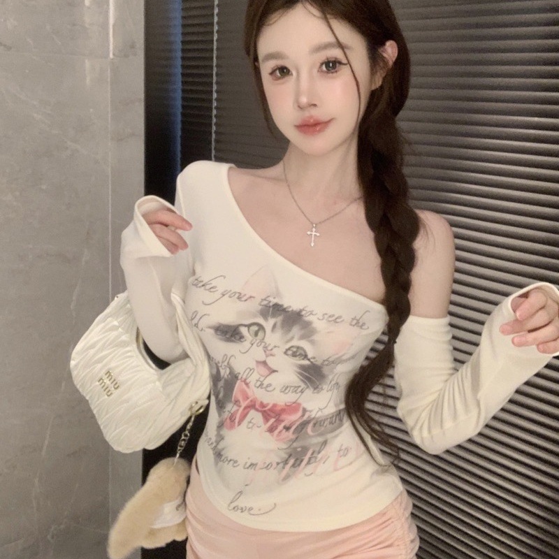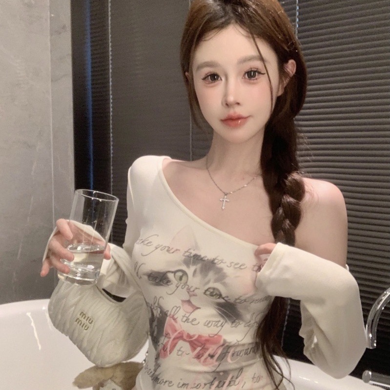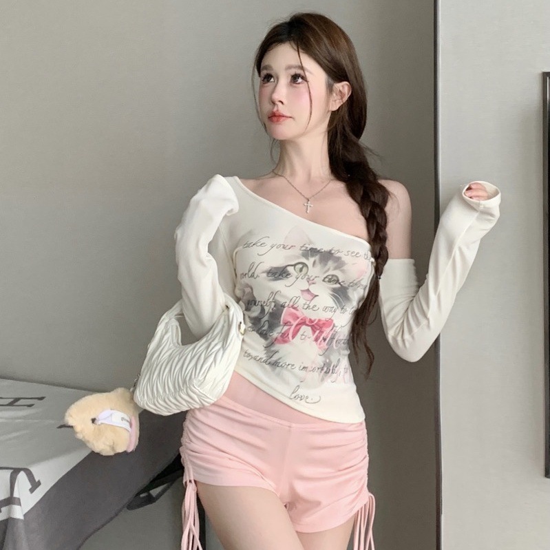 夏季新款女纯欲辣妹不规则斜肩时尚小众设计感薄款罩衫T恤衫上衣