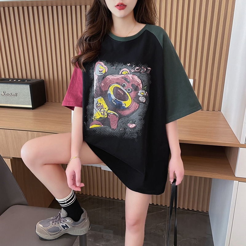 大码女装韩版宽松慵懒风撞色短袖T恤女设计感小众复古潮牌上衣服