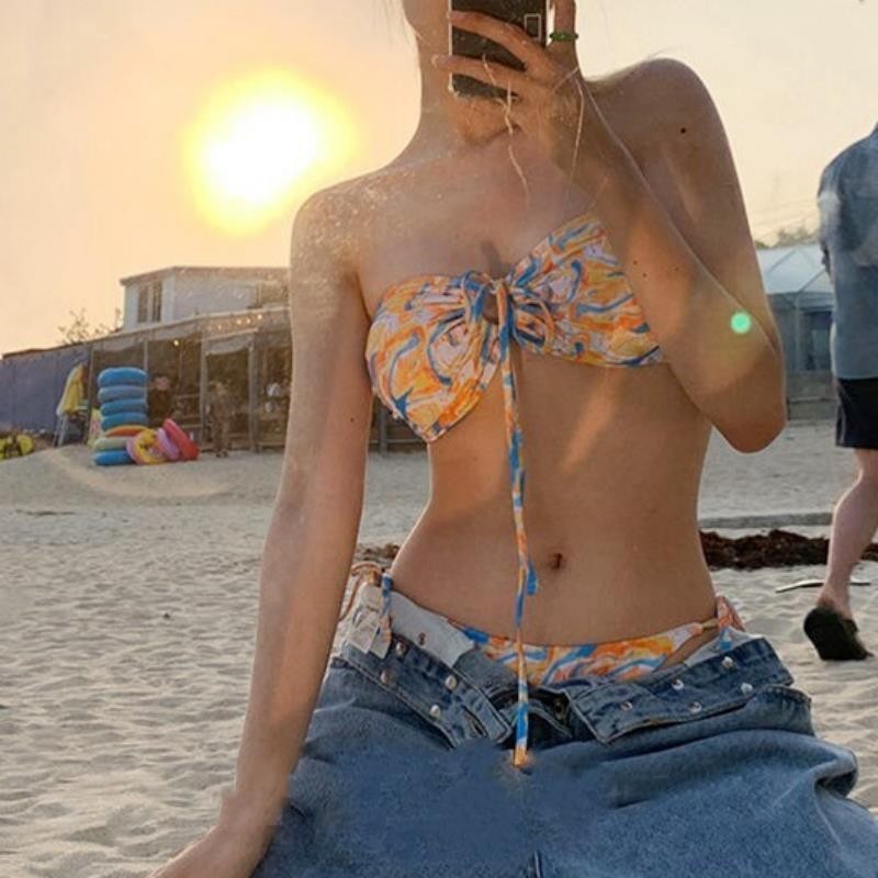 韩国内搭夏季新款泳衣女碎花抹胸韩版比基尼背心吊带辣妹度假沙滩