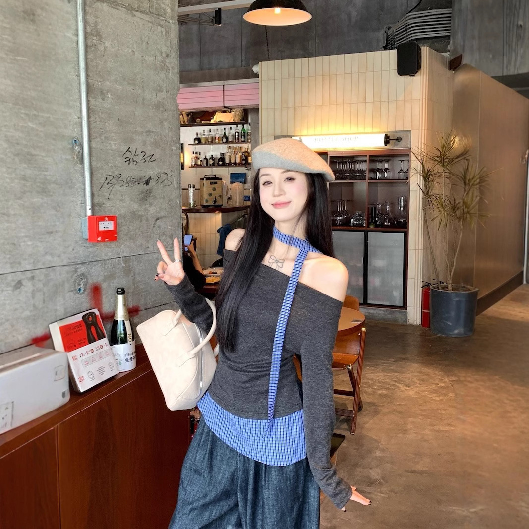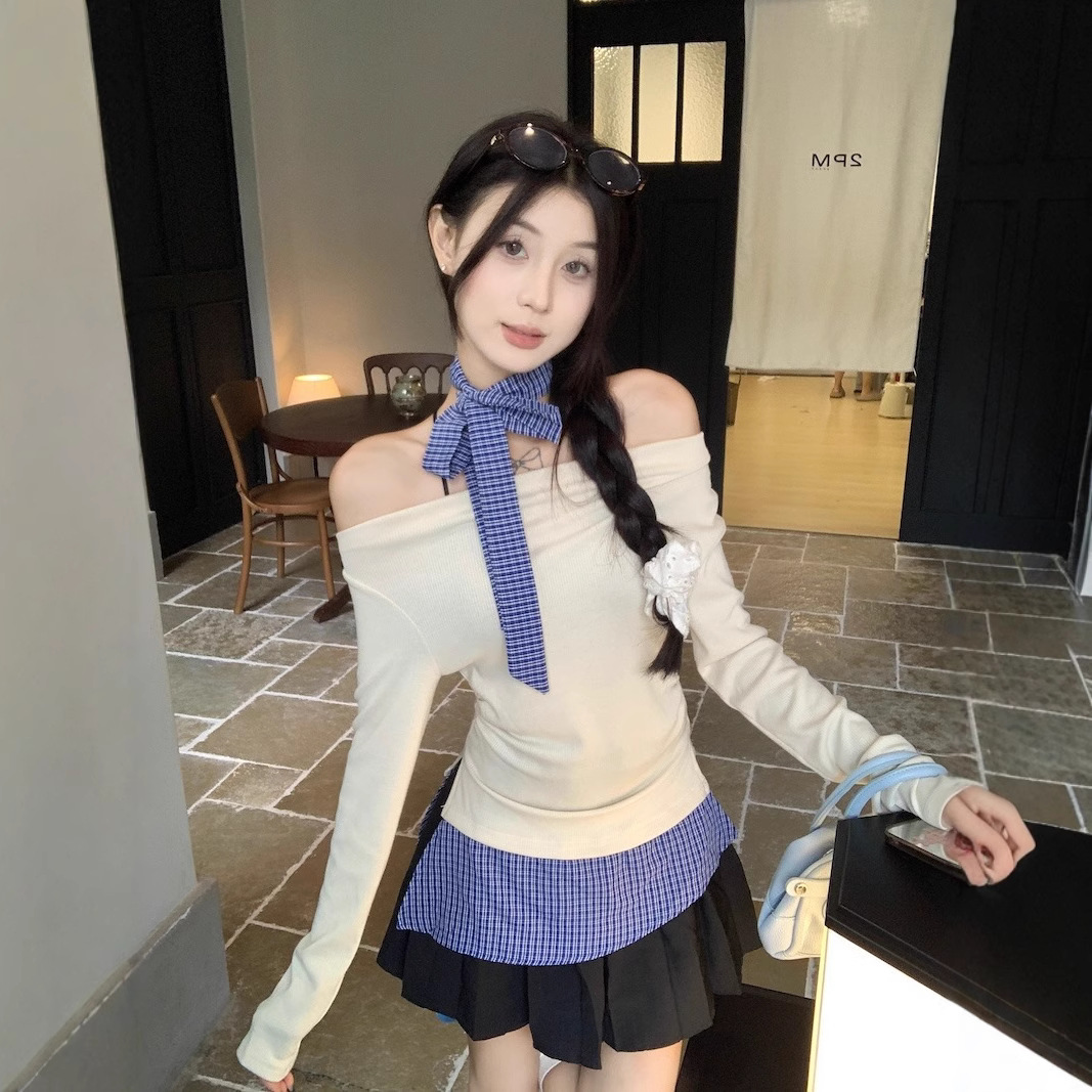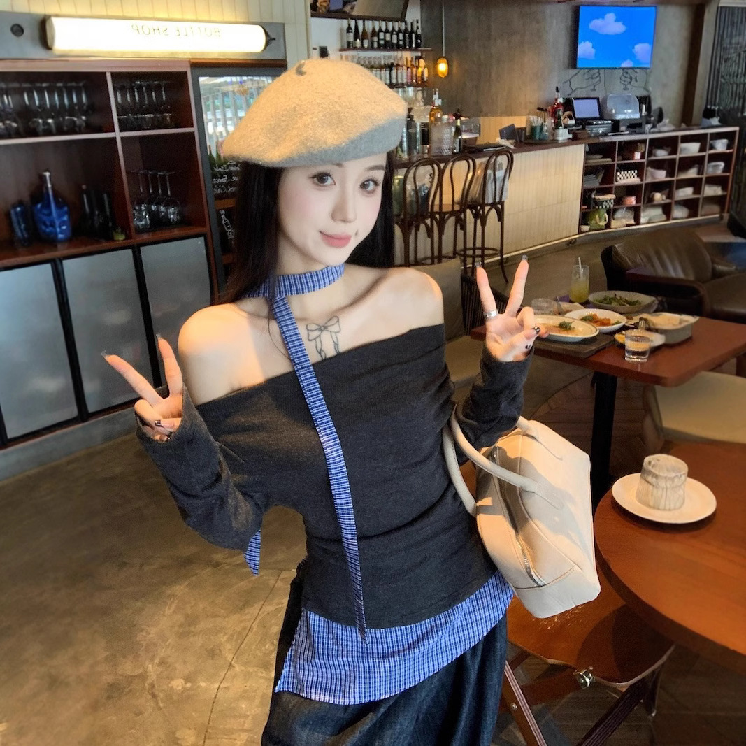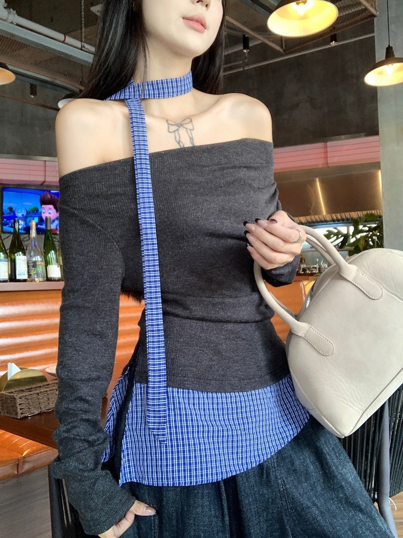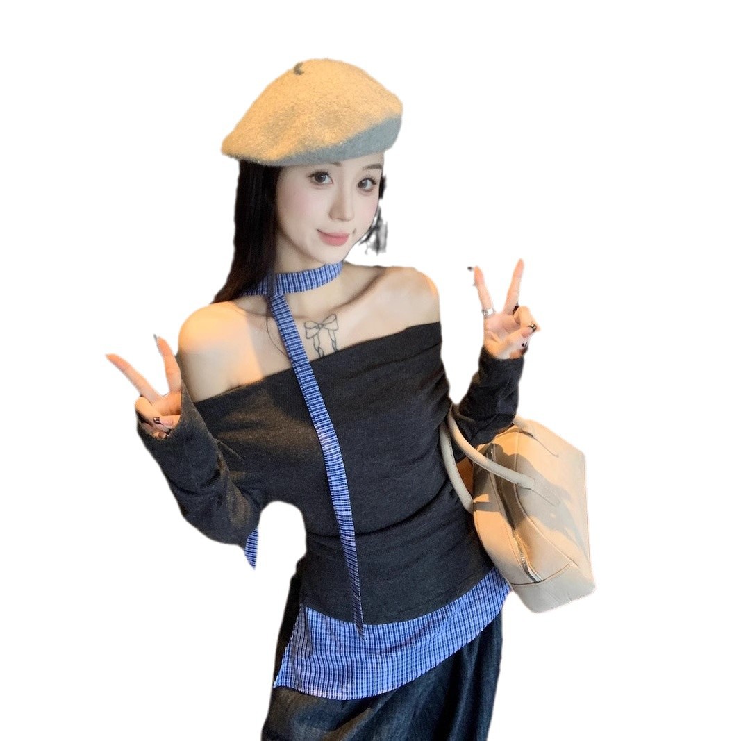 2025新款韩版修身显瘦设计感一字肩辣妹格子拼接长袖T恤打底衫女