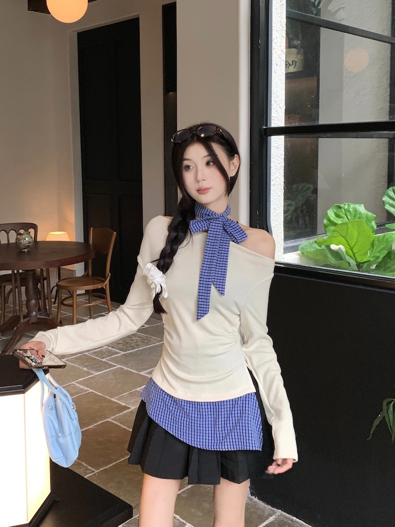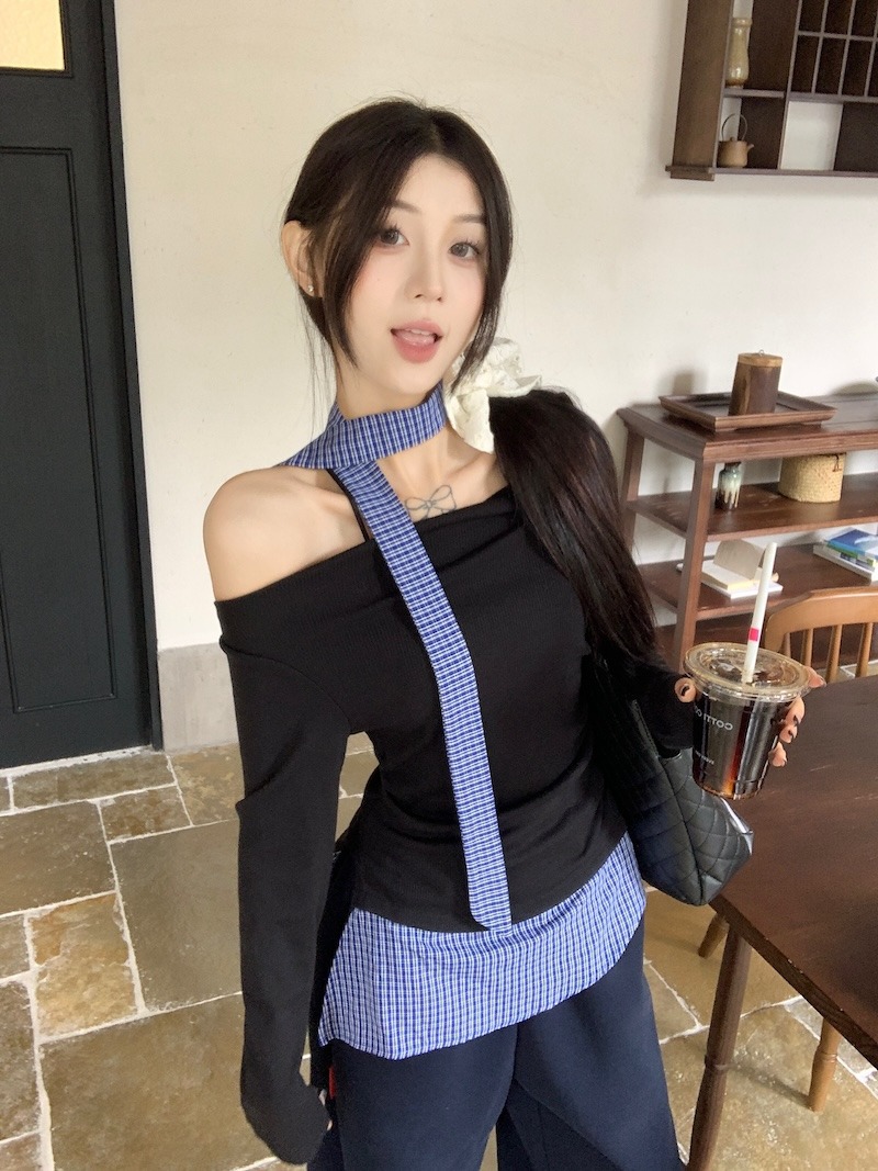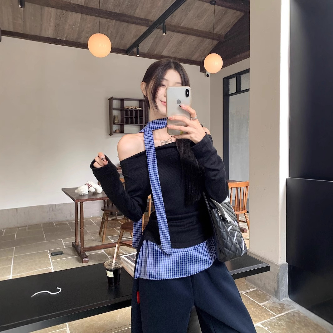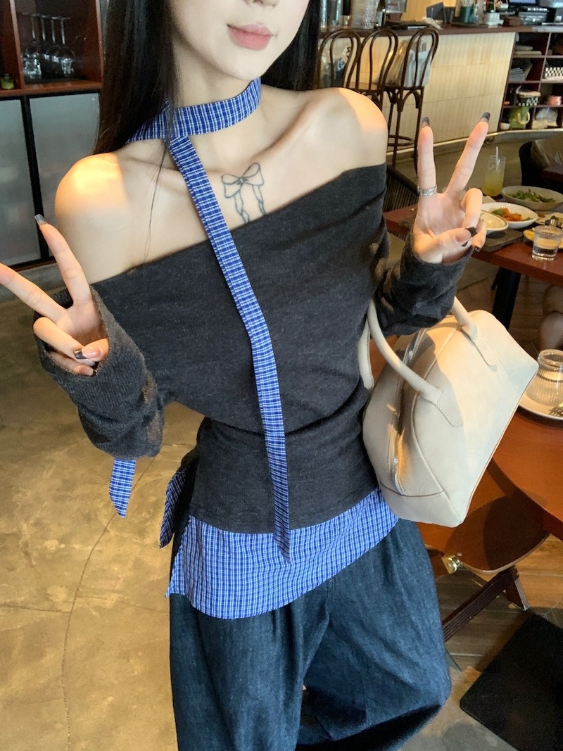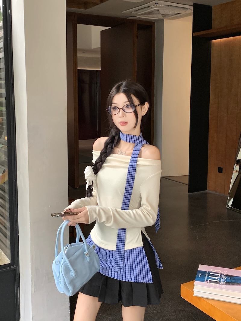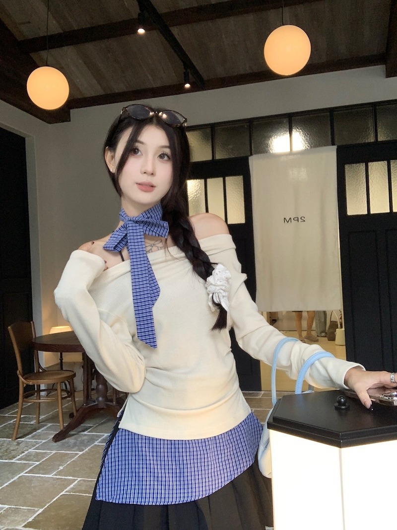 2025新款韩版修身显瘦设计感一字肩辣妹格子拼接长袖T恤打底衫女
